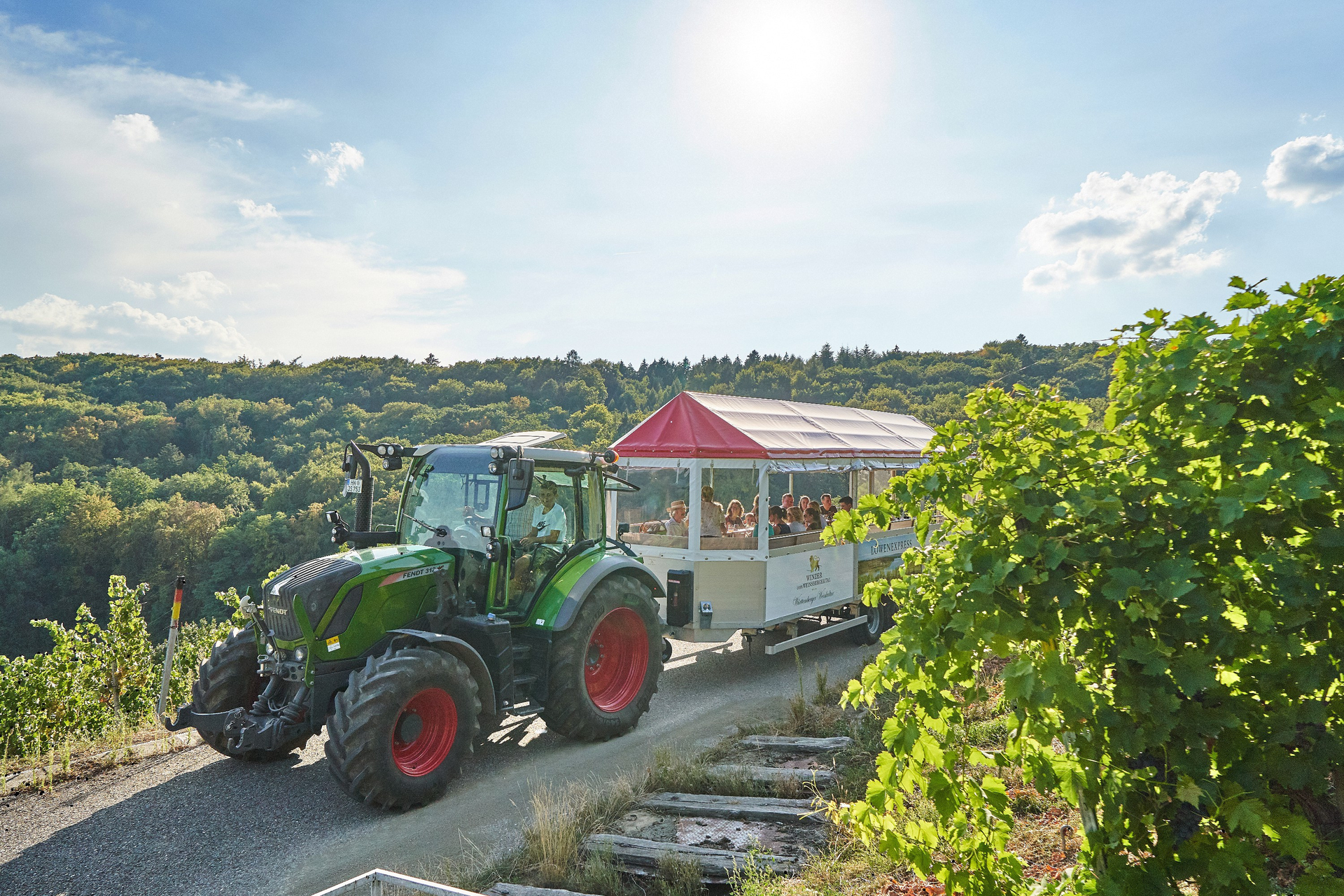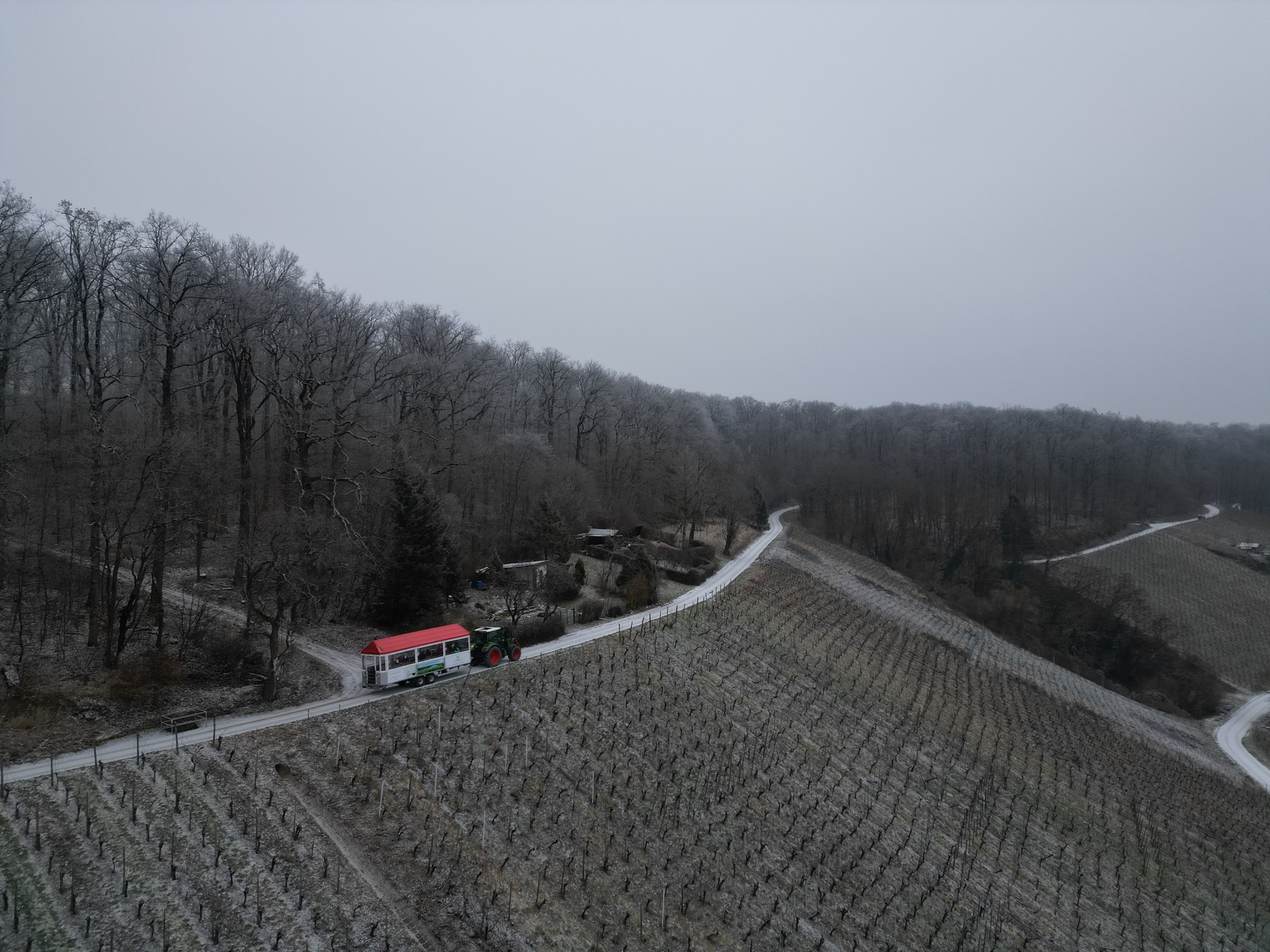 Der Löwen-Express ist ein komfortabel eingerichteter Planwagen für bis zu 22 Personen. Durch die erhobene Position gleitet man erhaben durch die Weinberge - ein Blick von oben auf´s Rebenmeer.