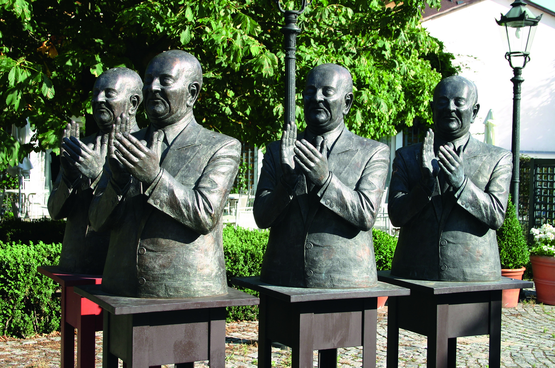 Für die Figurengruppe „Die Claques“ platziert Guido Messer Büsten von vier identischen männlichen Figuren auf grazile Postamente. Eines sticht aufgrund der signalroten Einfärbung aus diesem gleichartigen Konglomerat heraus. Eventuell könnte es sich hierbei um die Hervorhebung eines „primus inter pares“ handeln. Die Augen der applaudierenden Stimmungsmacher sind geschlossen, was die Frage aufwirft: Was oder wer wird hier „unbesehen“ von einer kollektiven Masse beklatscht? Der Künstler äußert hiermit seine allgemeine Autoritäts-, Obrigkeits- und Demokratiekritik.