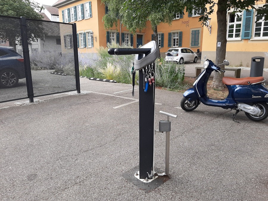 Der RadSERVICE-Punkt ist eine rund um die Uhr zugängliche Station und enthält Werkzeuge und eine Luftpumpe, womit kleinere Reparaturen schnell durchgeführt werden können.