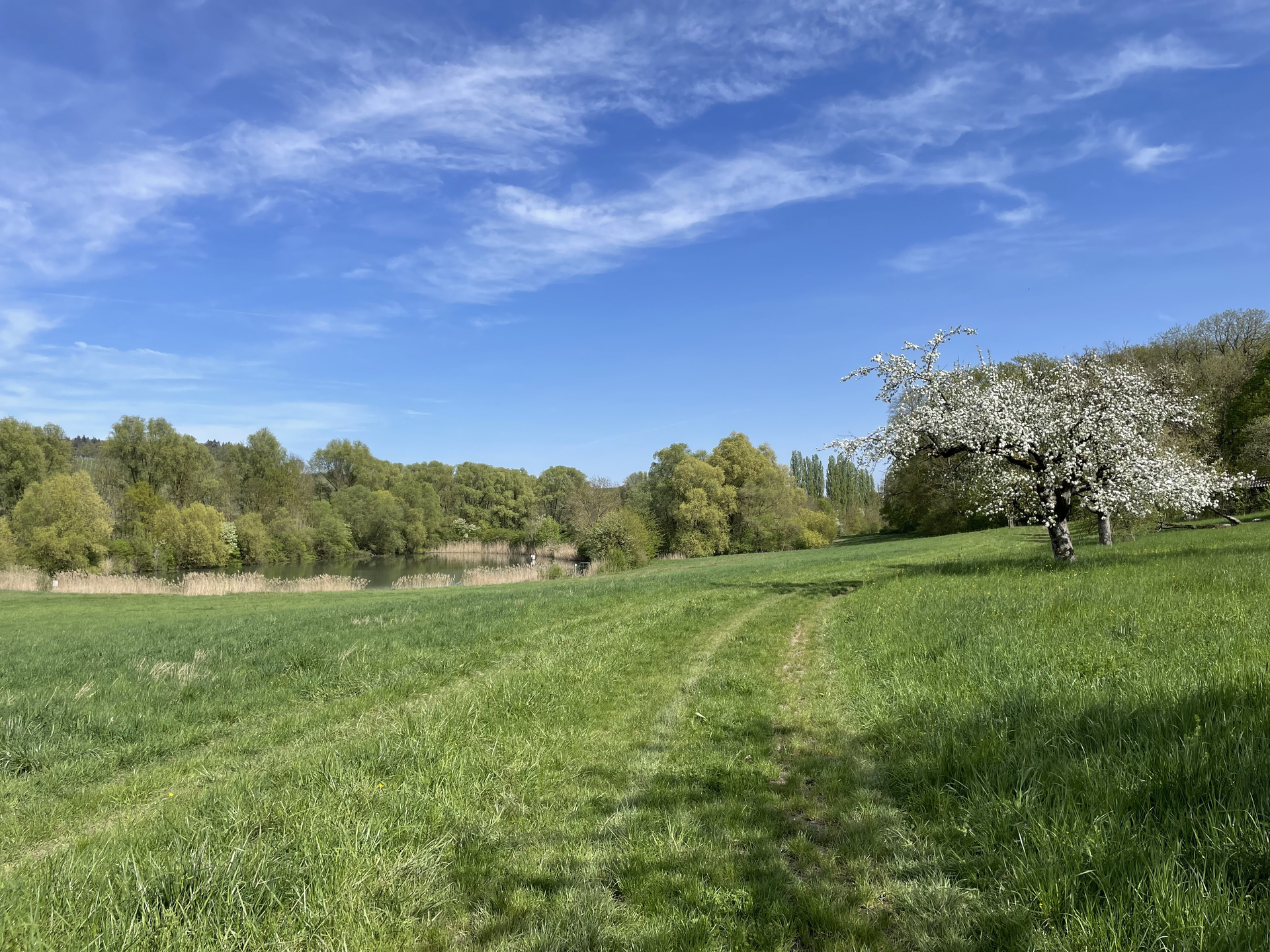 dem Wald heraus wandern wir entlang einer bunt blühenden Streuobstwiese