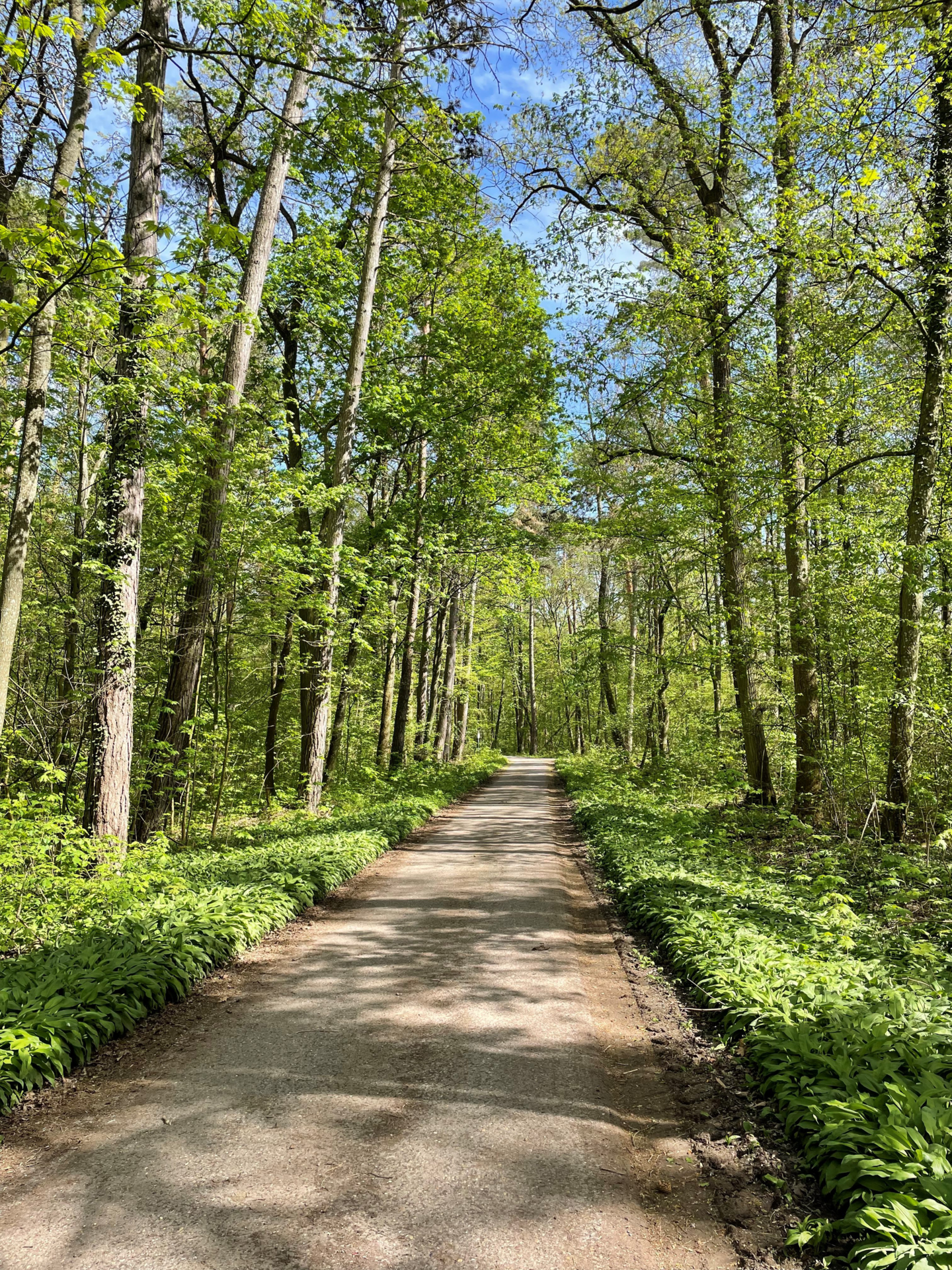 Der Weg führt weiter in den Haberschlachter Wald, durch den im Sommer die Sonnenstrahlen blitzen.