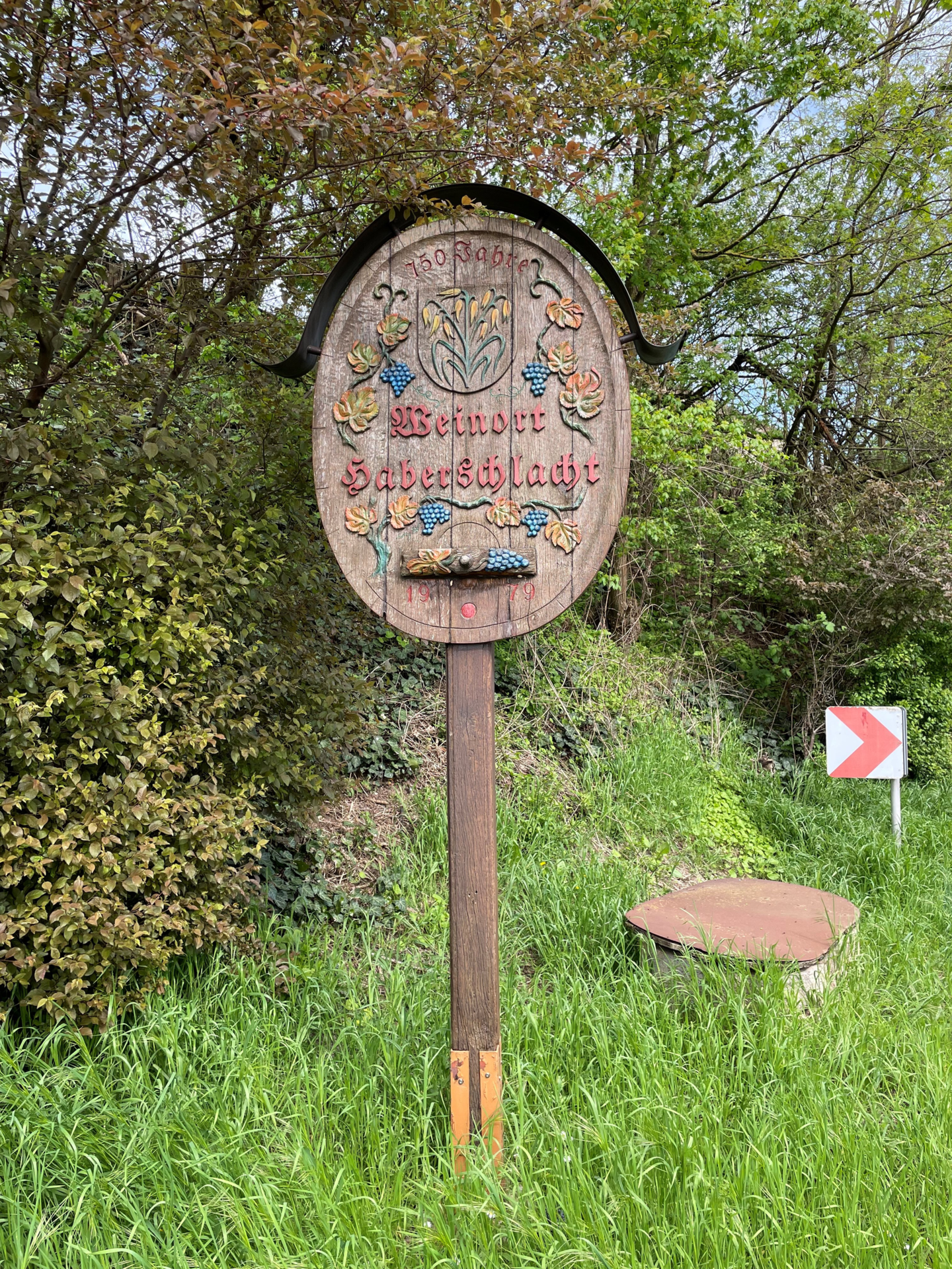 Am Ortsschild geht es über die Straße auf einen Schotterweg. Hier kann auch das alte Weinort Haberschlacht-Schild bestaunt werden. Dem Weg