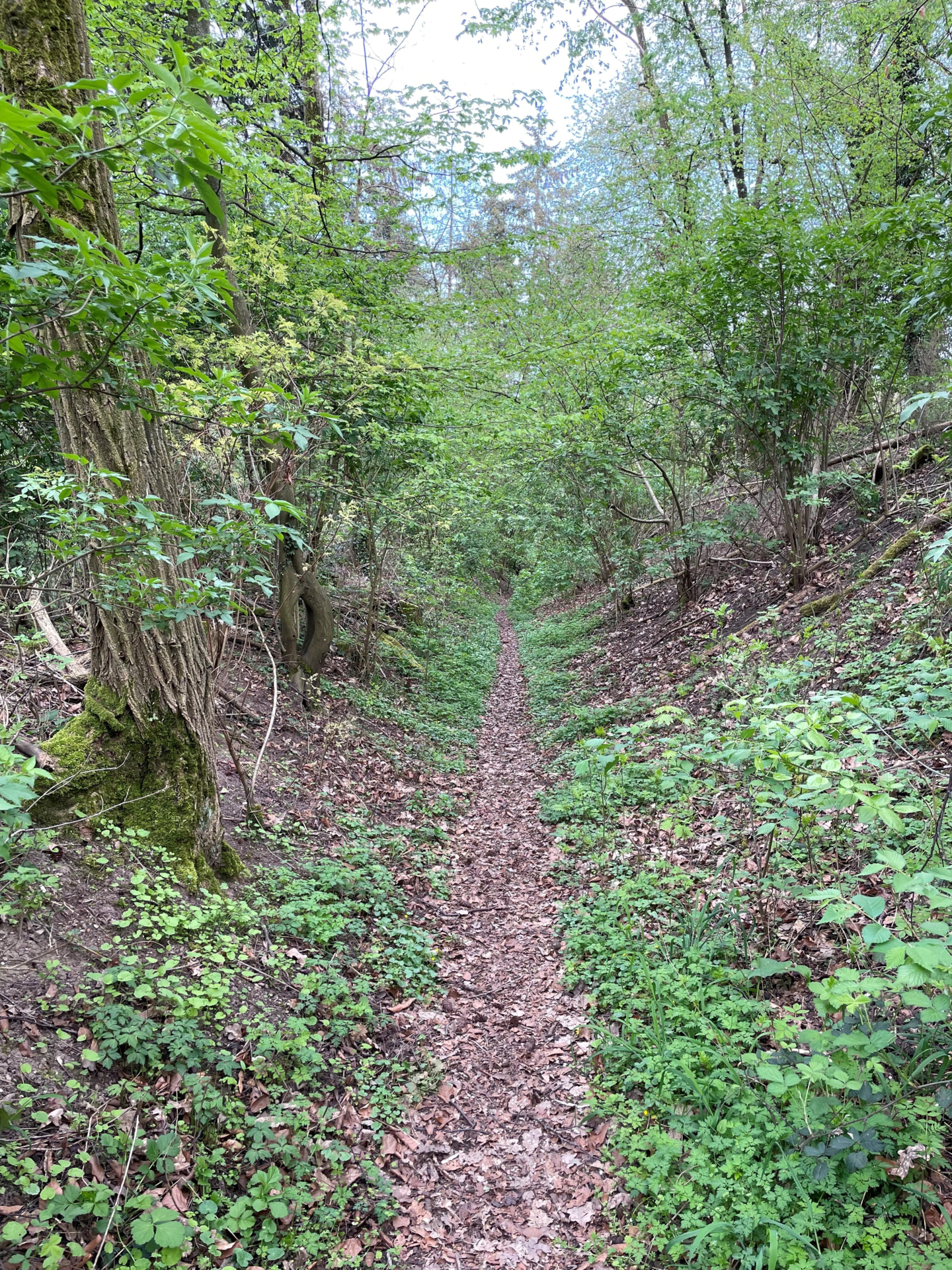 folgend kommen wir vorbei an der Teerhütte und biegen kurz darauf auf einen kleinen, mystischen Weg ab. Lass Dich mitnehmen auf die Reise in eine andere Welt, Bäume, Moos und Gräser sorgen für eine besondere Stimmung entlang des Weges. Nach einer kleinen Steigung kommen wir am Aussichtspunkt an, von dem aus sich das Zabergäu und der Weinort Haberschlacht bewundert werden können - Weinreben, Wald, Wiesen und Felder soweit das Auge reicht.