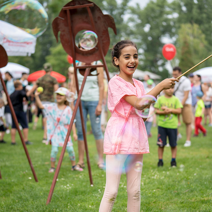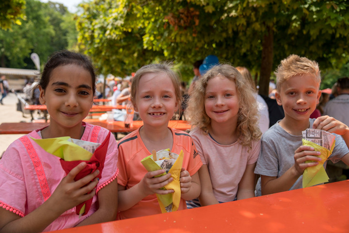 Während die Kinder spielen, können sich Eltern an den Infoständen umsehen oder in gemütlichen Liegestühlen entspannen. Wer Kraft tanken möchte, kann dies international: Es gibt Falafel, Pinsa, Burger, Pommes, Eis und Zuckerwatte – für jeden Geschmack etwas dabei!
