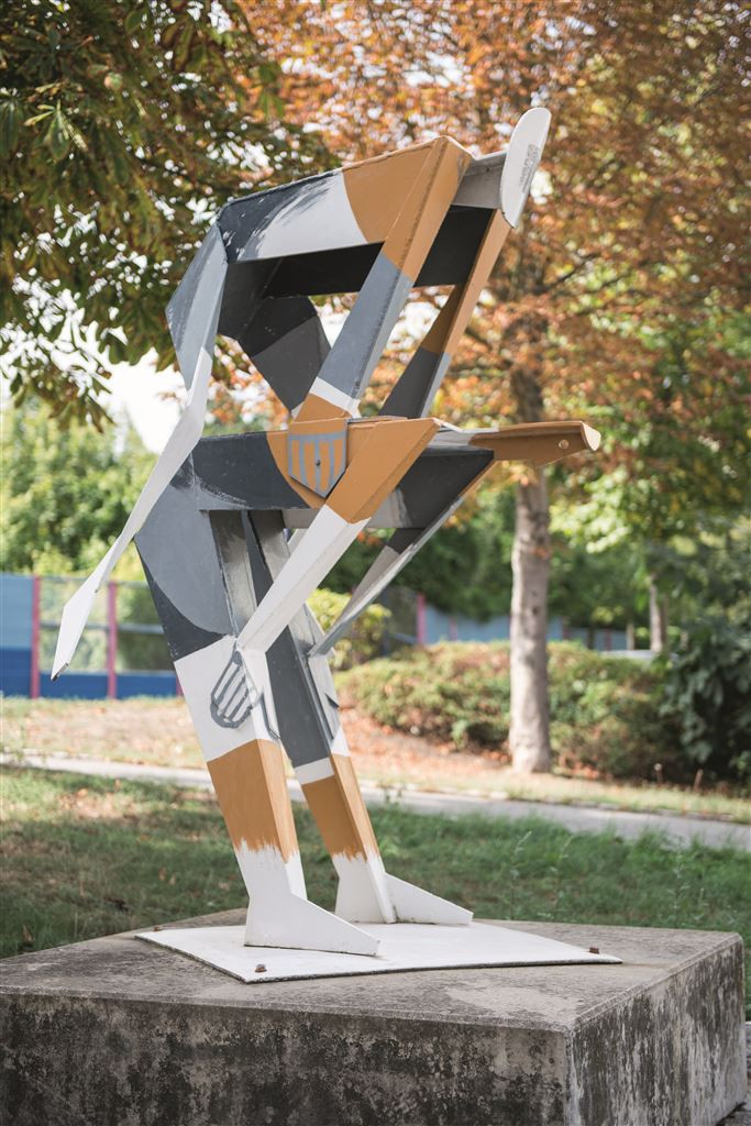 Heinz Friedrich schuf mit dem Bockspringer eine additive Zusammenkunft von geometrischen Grundformen. Die kantige Aufeinanderfolge von Formen fügt sich zu eben jenem aktiven Bockspringer, der über eine gebeugte, statische Figur hüpft. Die Figurengruppe beinhaltet neben Dynamik und Statik den Gegensatz Schwere des Werkstoffs und Fragilität der Einzelformen. Die Fassung mit ihren abwechselnd grauen, weißen und gelben, nicht streng definierten Streifen und Flächen legt ein expressionistisches Gewand über die Figurengruppe und führt so zu einer homogenen Gesamtwirkung.