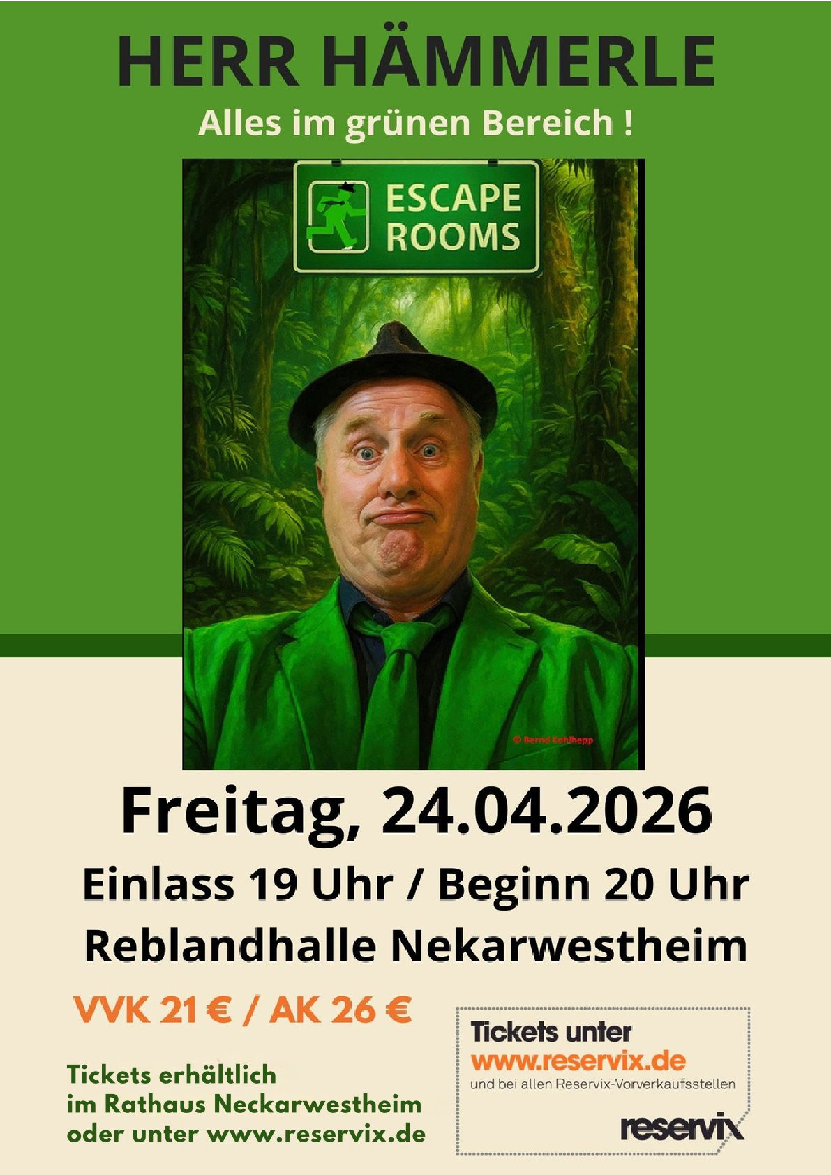 Mit seinem neuen Programm „ESCAPE ROOMS – alles im grünen Bereich!“ bringt Herr Hämmerle frischen Wind auf die Bühne und zeigt einmal mehr, warum er zu den beliebtesten Figuren der schwäbischen Kleinkunst gehört. Schlagfertig, spontan und voller Energie meistert er Situationen, die von Escape Rooms über Survival Camps bis hin zum ganz normalen Alltagschaos reichen. Dabei begeistert er mit seiner unverwechselbaren Mischung aus Situationskomik, Dialektwitz und scharfem Humor.