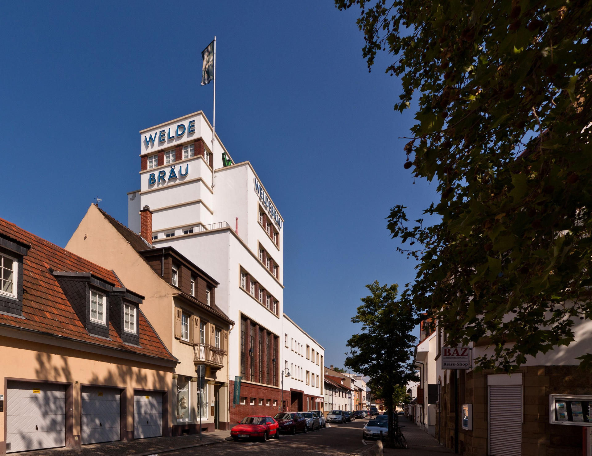 Die Welde-Brauerei wurde 1752 als kleine Hausbrauerei des Gasthauses „Grünes Laub“ in der Mannheimer Straße 2 gegründet. Als Folge der Expansion wurde 1934/35 ein mehrstöckiges Sudhaus in der Herzogstraße mit einer stattlichen Höhe von 36 m erbaut. Das heute in Privatbesitz befindliche Gebäude ist eines von wenigen Beispielen in Schwetzingen, die eine Bauhaus-Ästhetik aufweisen.