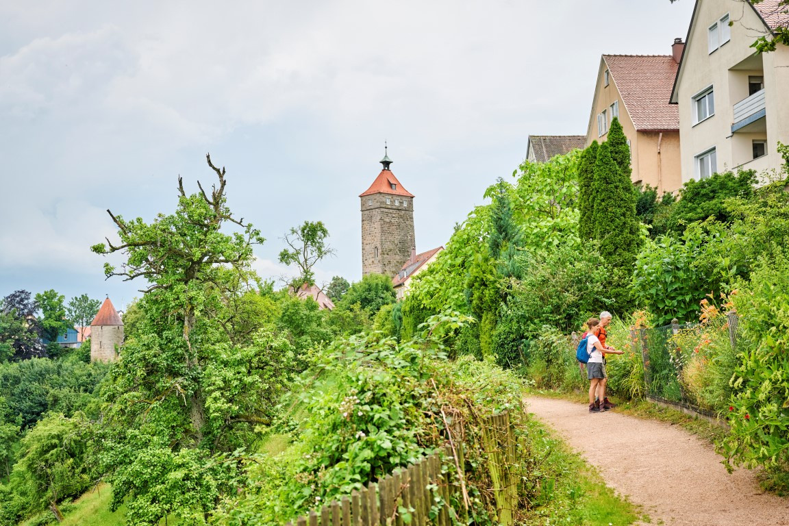 Unterhalb von Schloss Waldenburg geht es zur Ostseite der Stadt. Entlang kleiner Gärten und historischer Mauern läuft du bis zum Ende des Höhenrandwegs. Wenn du einen Abstecher in die Altstadt machen möchtest, gelangst du an der Ostseite über wenige Treppen vom Höhenrandweg aus dort hin.