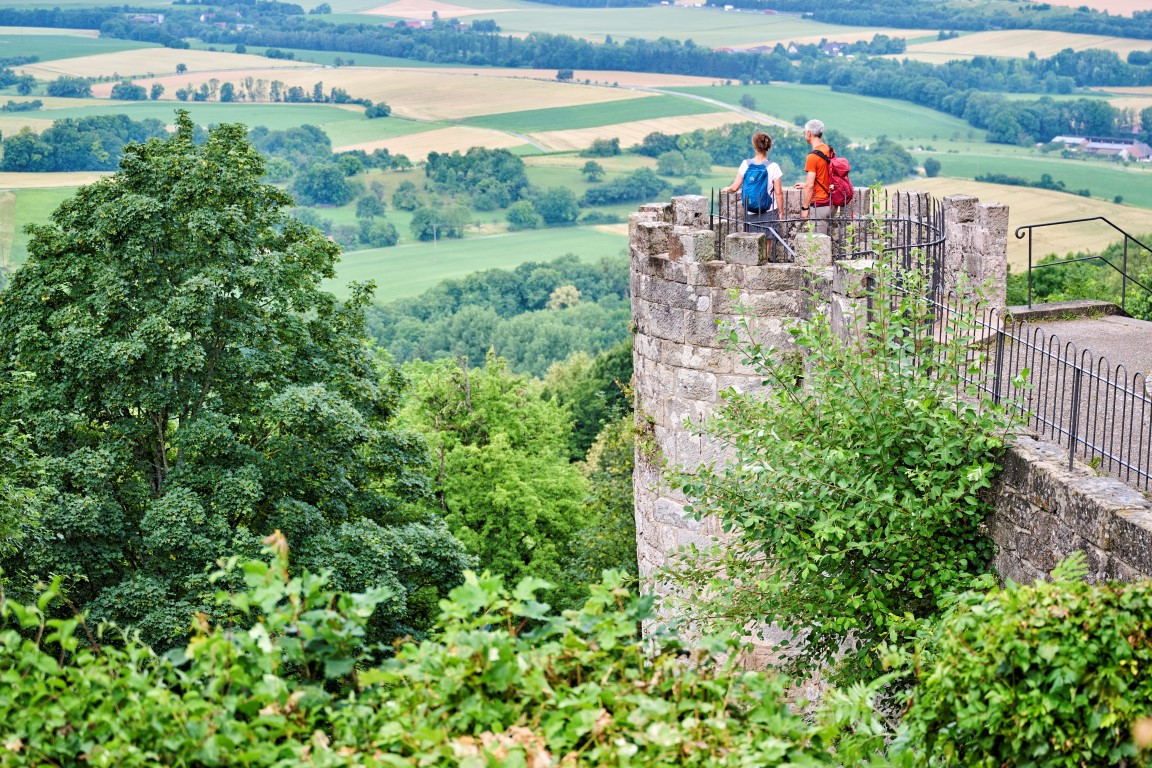 Auf der Aussichtsplattform an der Westseite der Stadt kannst du bei guter Sicht den Katzenbuckel im Odenwald sehen. Anschließend verläuft der Weg unterhalb des bekannten Schlosses der Fürsten zu Hohenlohe-Waldenburg.