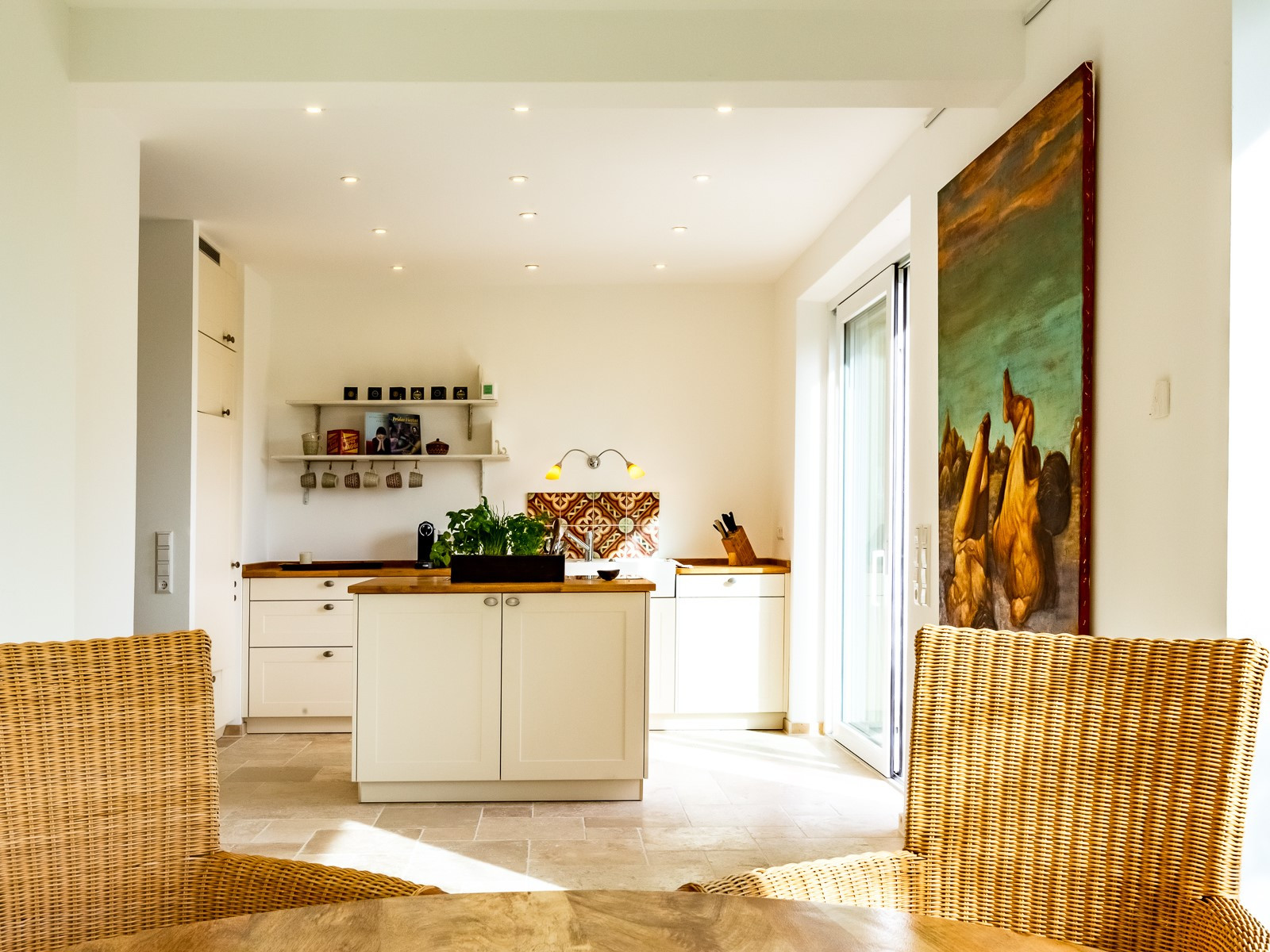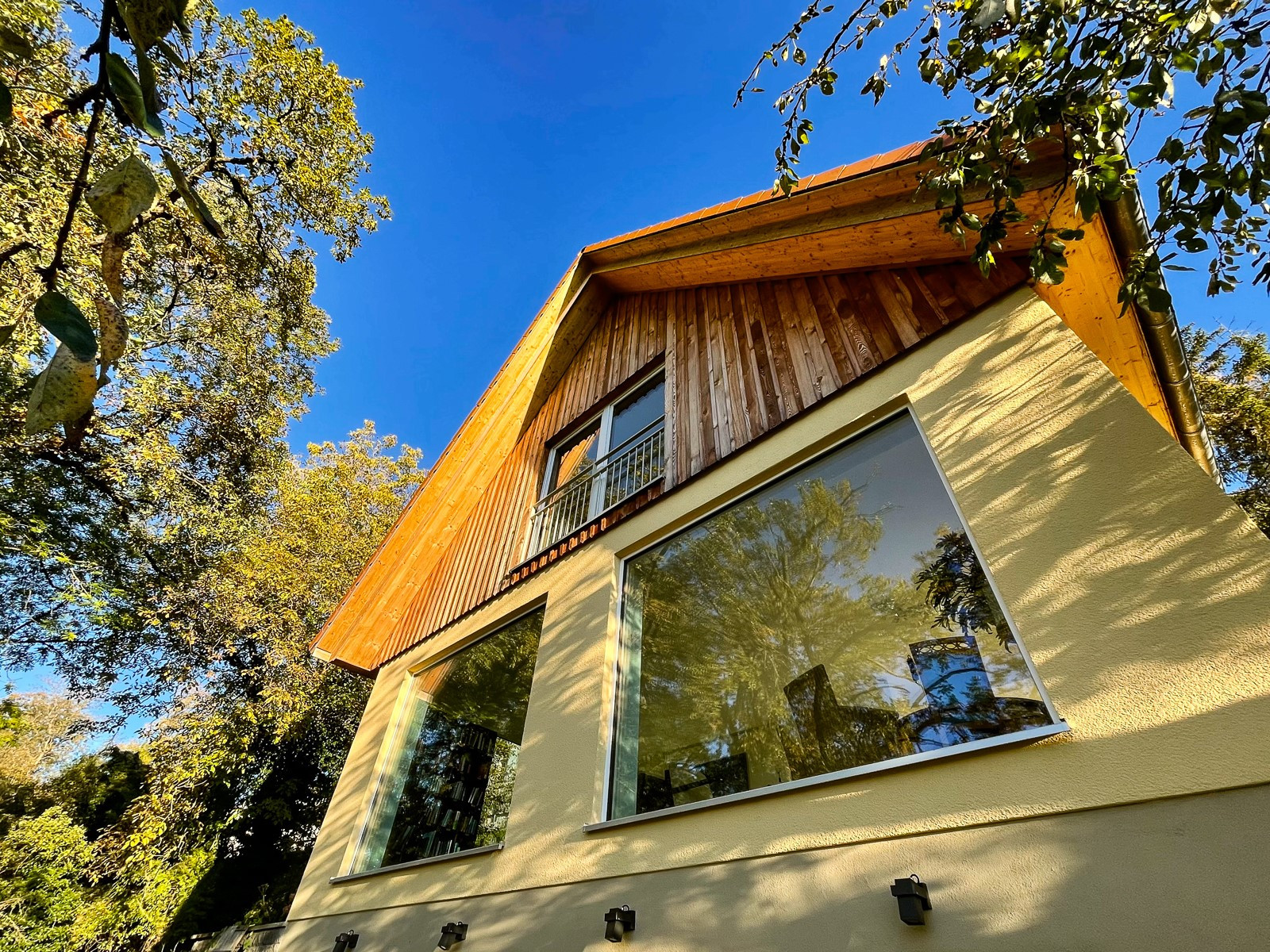 Das Haus mit 170qm Wohnfläche liegt im Landschaftsschutzgebiet am Südhang des Luftkurortes Langenburg hoch über dem romantischen Jagsttal in einem großen Obstbaumgarten. Die Architektur des Hauses, welches Ende 2021 fertiggestellt wurde, fügt sich perfekt in die Landschaft ein und ist eine gekonnte Mischung aus tradierten und modernen Bauformen.