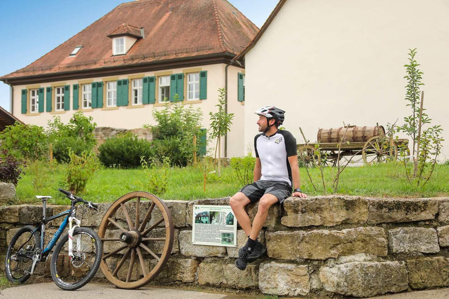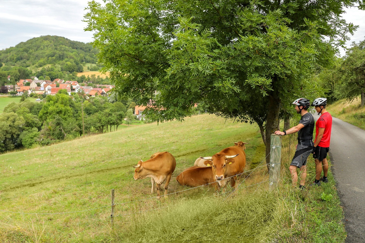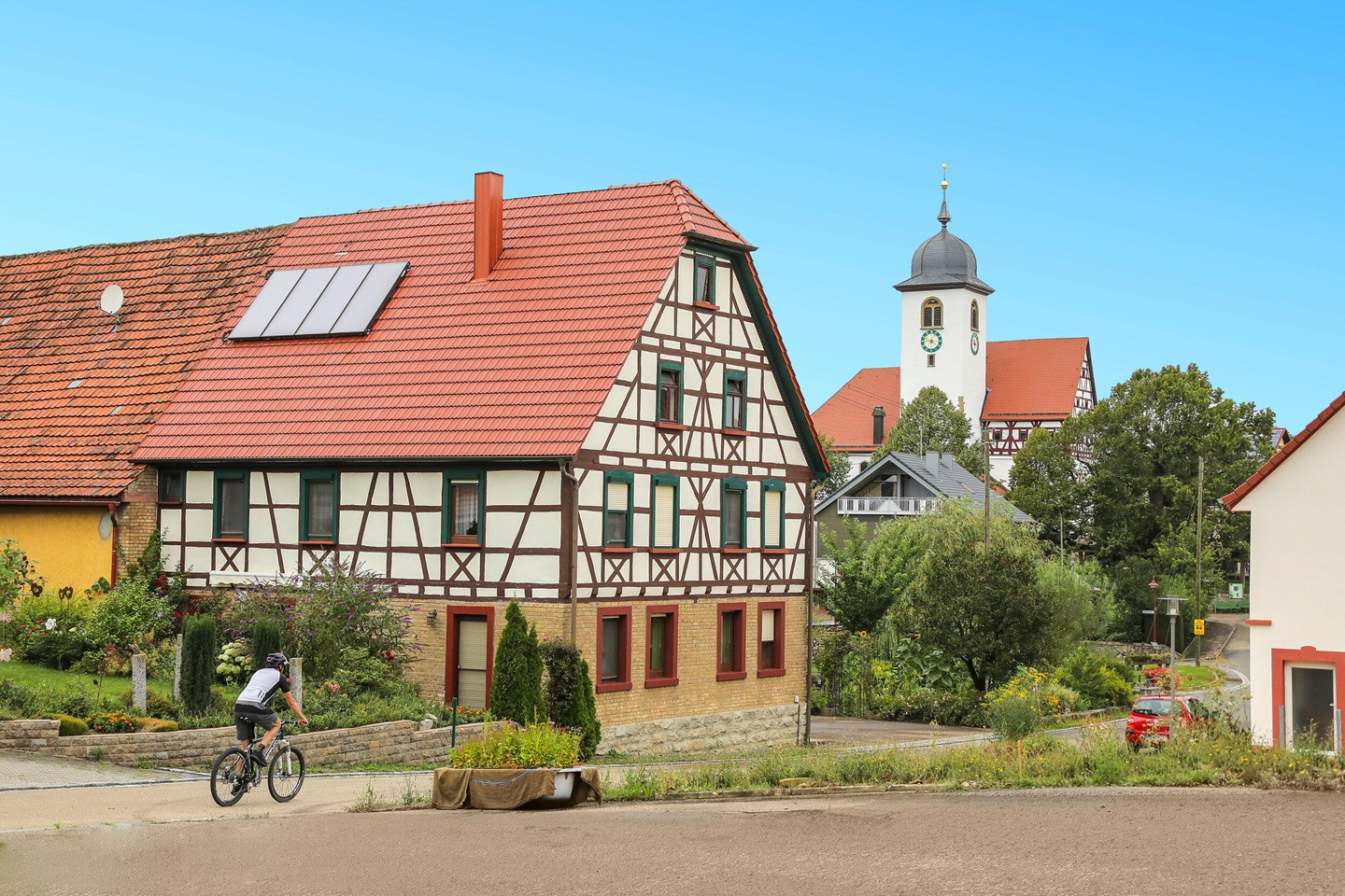Auf der Kreisstraße K2854 biegst du rechts nach Staigerbach ab. Unmittelbar nach dem Ortsende wieder rechts abbiegen und bergab nach Zaisenhausen. Überquere die Ettebücke und setze die Route, zunächst steilaufwärts nach Mäusdorf und anschließend nach Alkertshausen fort. Ab hier geht es sanft abwärts zurück nach Mulfingen.