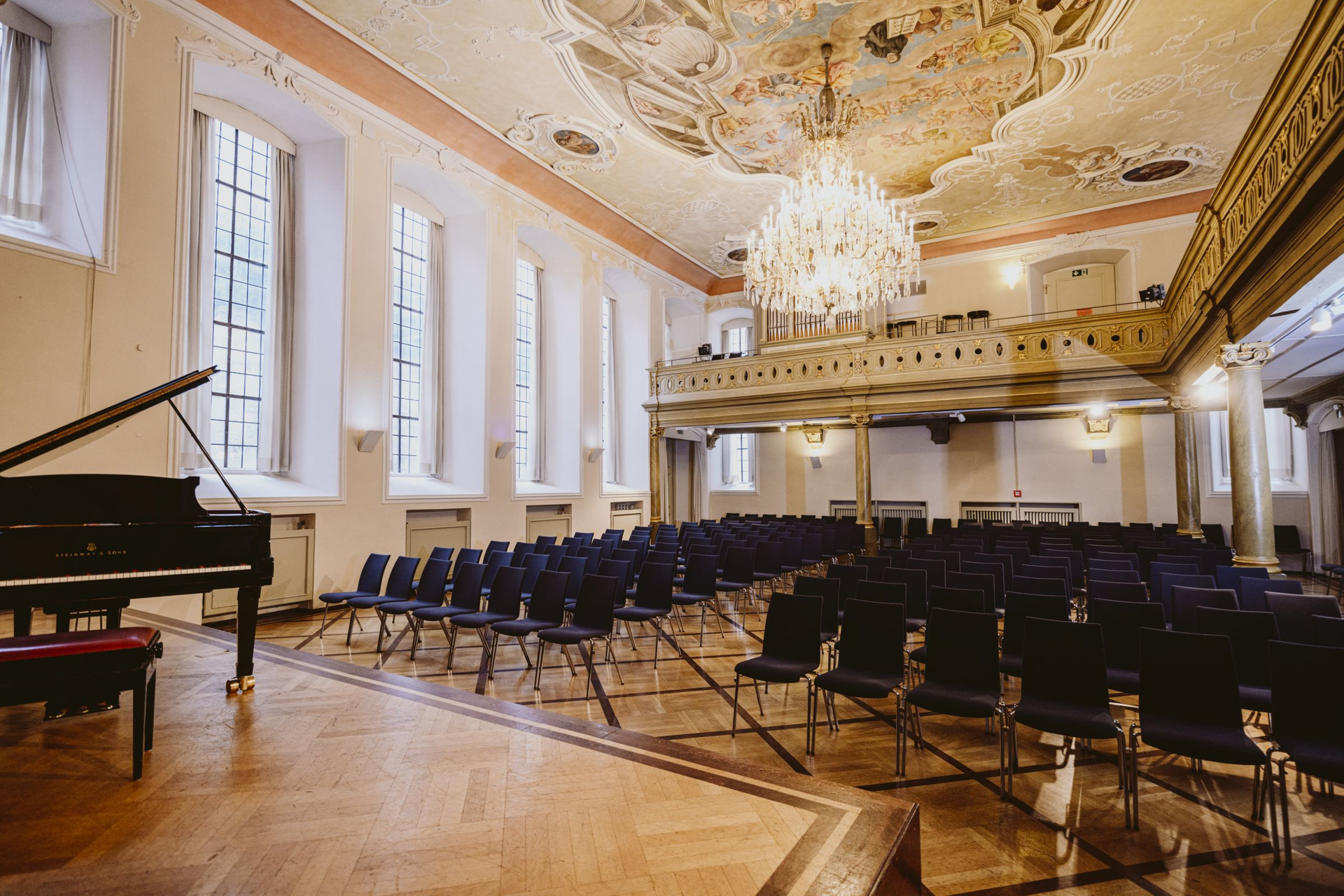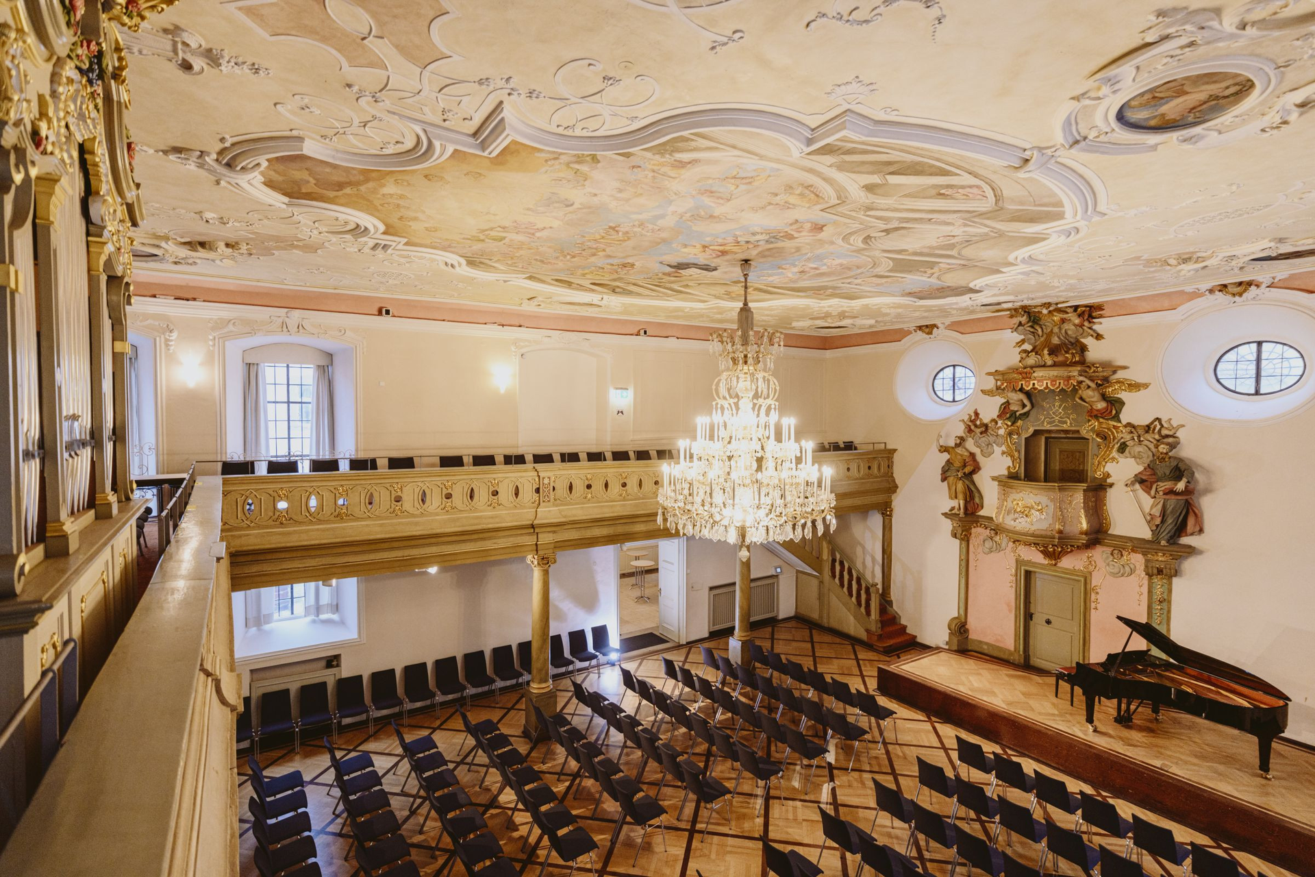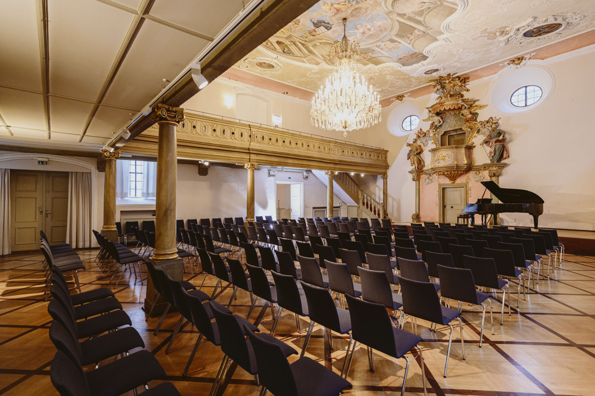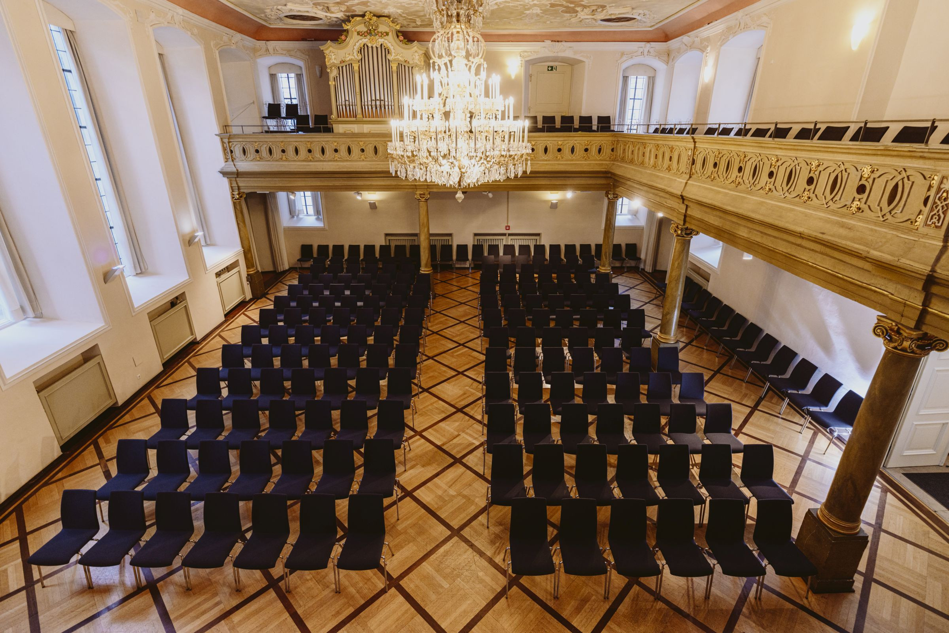 Die Hospitalkirche präsentiert sich als prachtvoller, barocker Kirchenraum, der durch hohe Rundbogenfenster vom Licht durchflutet wird. Der glänzende Festsaal mit seiner kunstvollen Stuckdecke, einem imposanten Kristallleuchter und einer hervorragenden Akustik schafft eine besondere Atmosphäre – ideal für Konzerte, Vorträge, Feiern oder Trauungen geeignet.