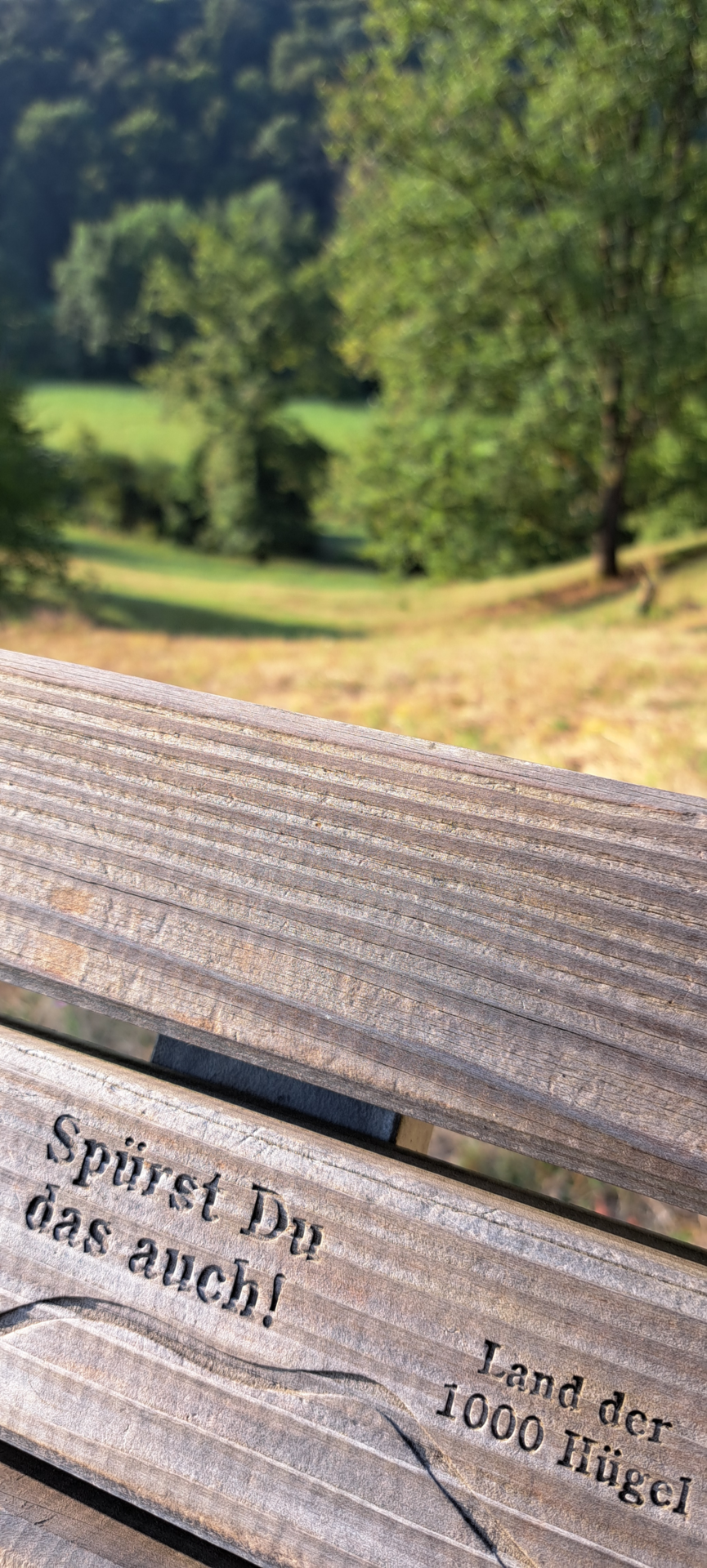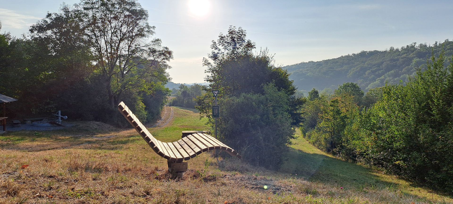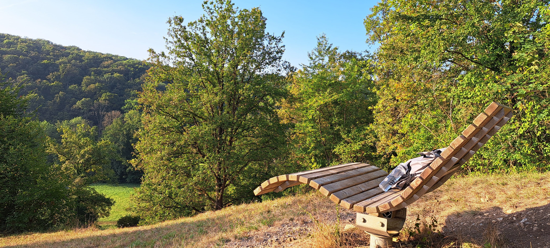 Lehn Dich zurück – und genieße auf dem Hügelsofa den Blick ins Kreuzbachtal, mitten im Land der 1000 Hügel.