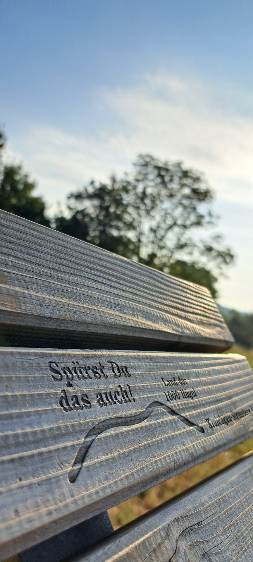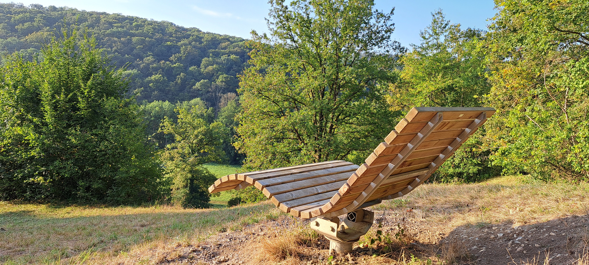 Eines der vielen Hügelsofas im Land der 1000 Hügel – und ein ganz besonderer Ort zum Innehalten. Die bequeme Holzliege lädt Dich zu einer entspannten Rast ein: Füße hoch, durchatmen und den herrlichen Blick ins Kreuzbachtal genießen. Du erreichst diesen Aussichtspunkt über den Hasenlauf-Rundweg. Und für alle, die länger verweilen möchten: Gleich nebenan befindet sich eine Grillstelle – ideal für eine gemütliche Pause mit Ausblick.