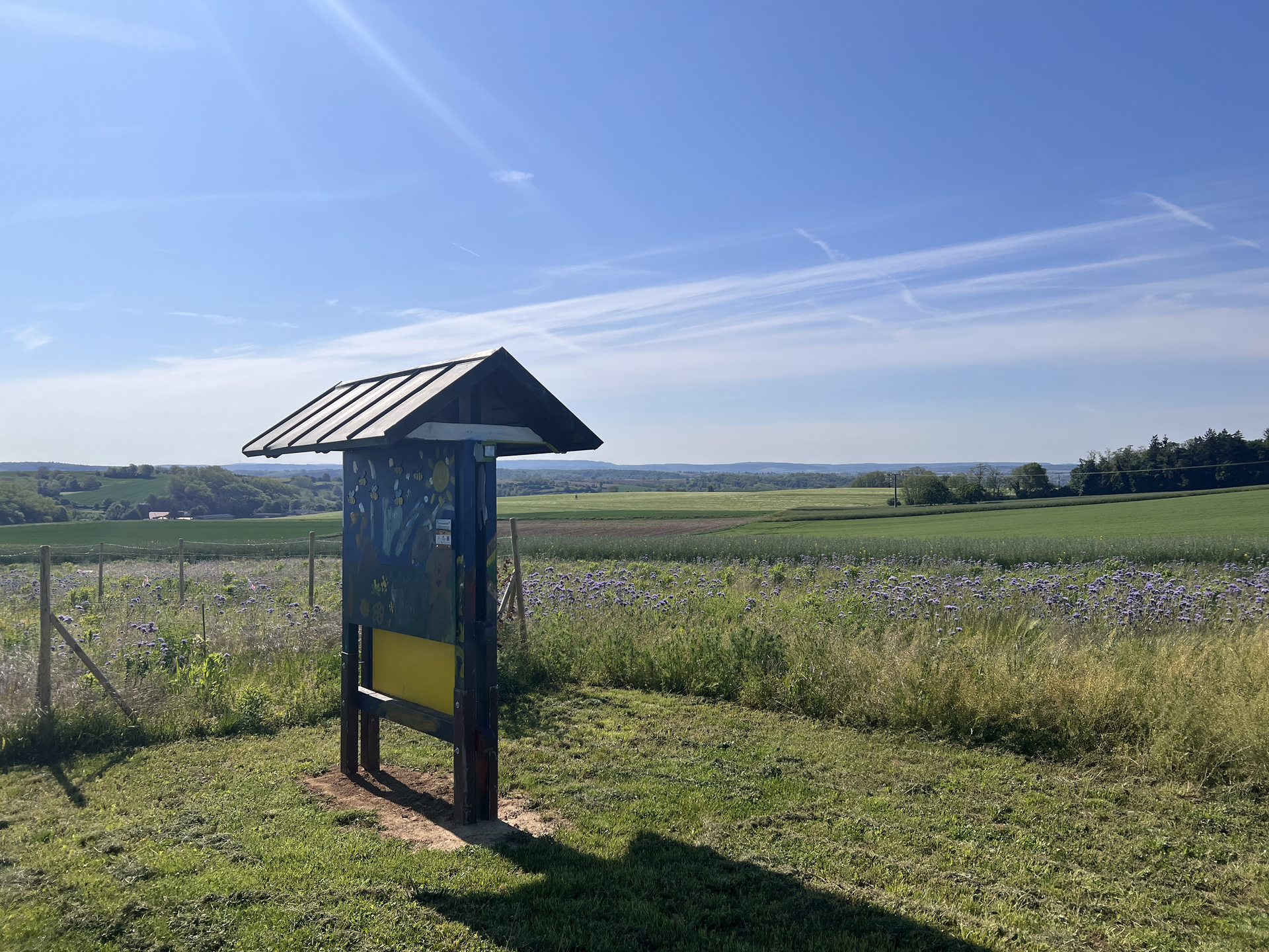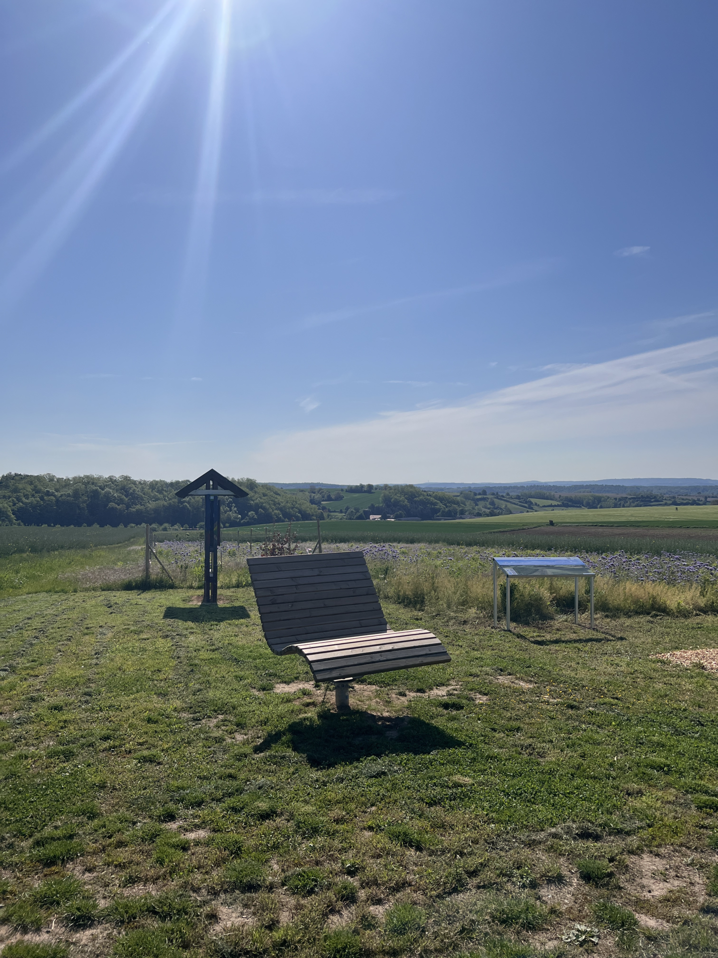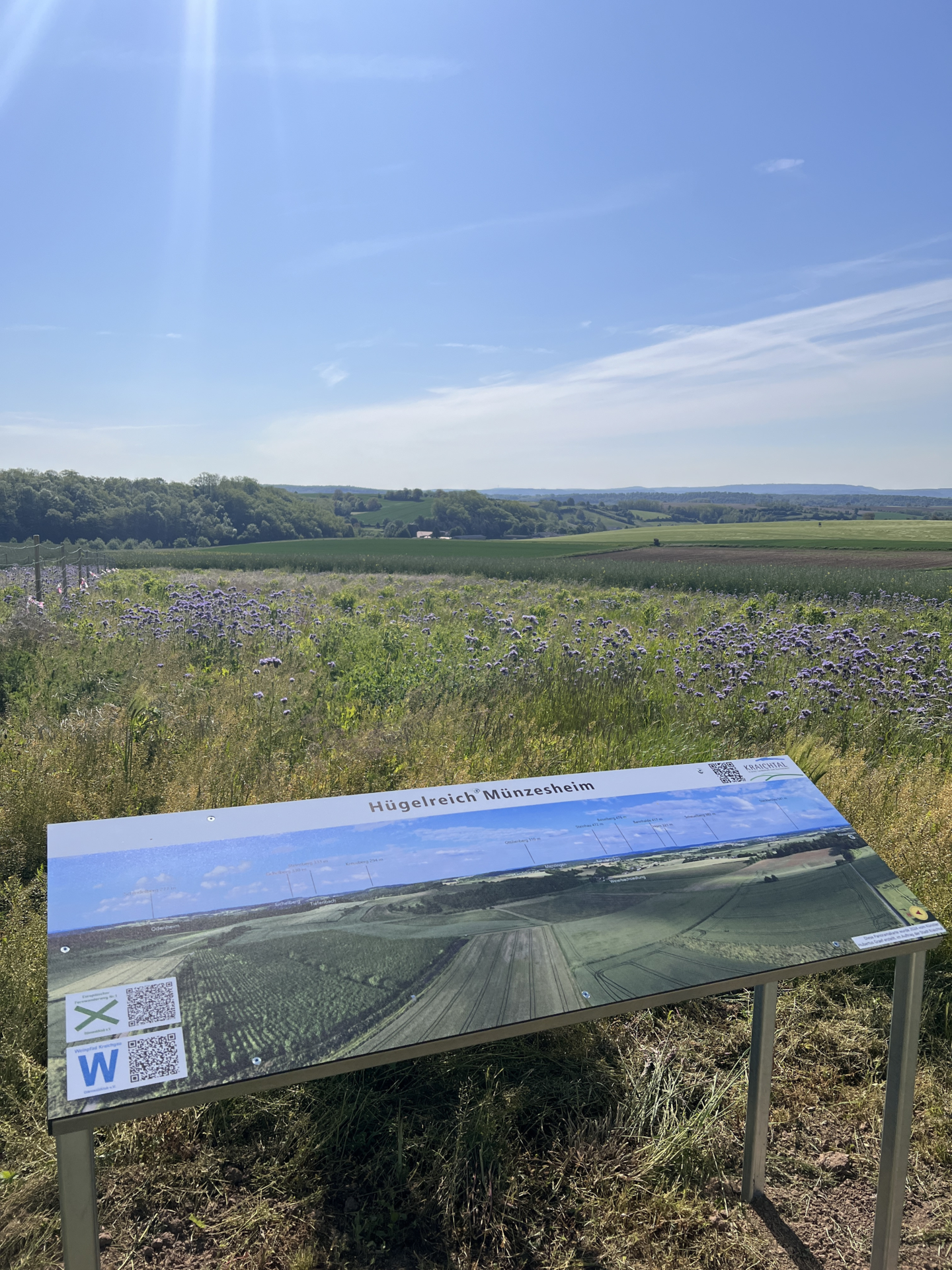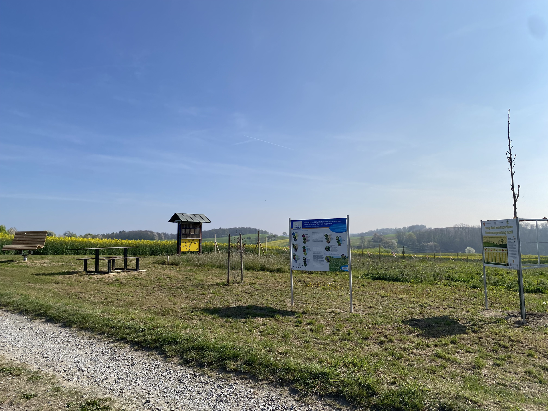 In gemeinschaftlicher Arbeit und mit Fördermitteln aus dem LEADER Regionalbudget hat die Projektgemeinschaft Stadt Kraichtal – NABU – Imkerverein – Grundstückseigentümer aus einer ehemals landwirtschaftlich genutzten Ackerfläche eine Natur- und Aussichtsfläche mit Rastplatz für Wanderer, Panoramatafel, Infotafeln, Blühwiese und Heckensträucher entstehen lassen.