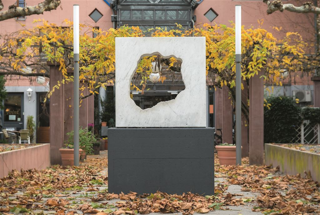 Hüseyin Altin wendet bei „Intra Muros“ stilistische Prinzipien der konstruktiven Plastik an. Das Augenmerk liegt auf einem homogenen Zusammenspiel der Materialien Naturstein und Gussstein, sowie der geometrischen Formen Rechteck und Quadrat. Ein Durchbruch des Marmorquaders gewährt einen poetischen Durchblick, zugleich erhält das Vollkommene die Anmutung des Mangelhaften. Das Rationale geht fließend in den emotionalen Bereich über und zeigt all das auf, was - rekurrierend auf Horaz´ „Episteln“ – im Geheimen an Sünde und Verfehlungen stattfinden kann.