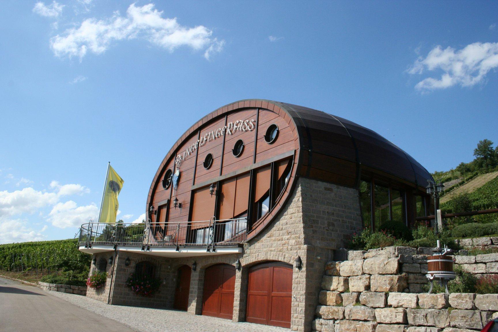 In den Weinbergen über der Stadt Ingelfingen thront das Ingelfinger Fass. Es ist ein architektonisches Meisterwerk: Das zweitgrößte Holzfass Europas verfügt über eine selbsttragende Konstruktionsweise.
