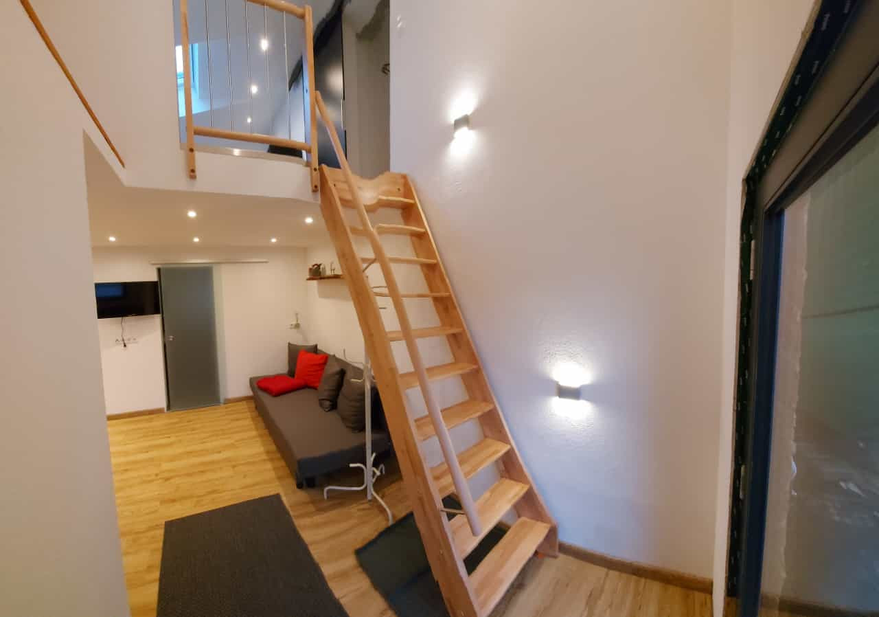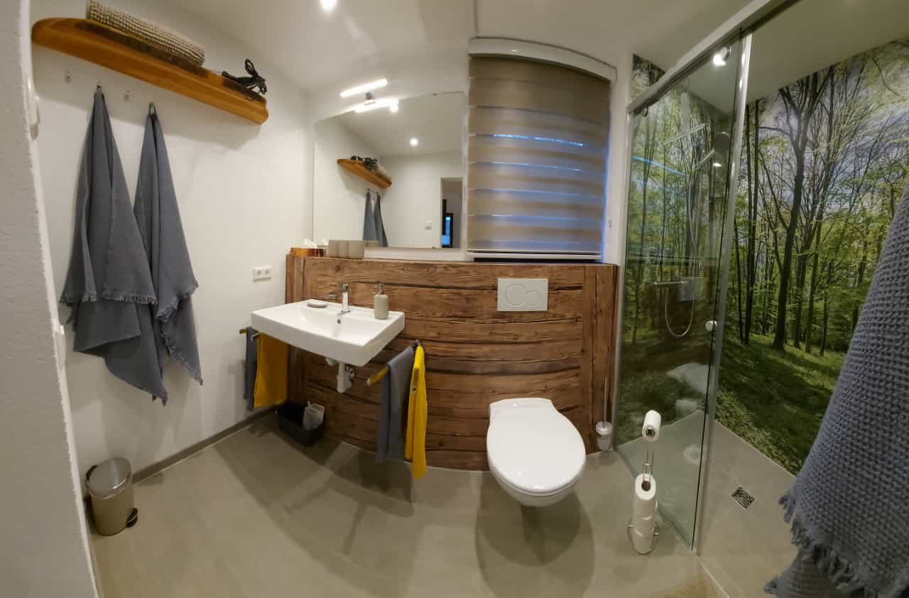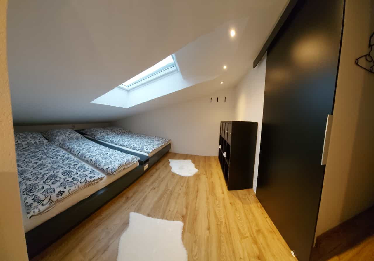 Ein Großteil der Ferienwohnung wurde selbst gestaltet. Das Holz kommt vom eigenen Wald. Die Betten wurden in die Nischen der Wohnung eingepasst und mit Holz verkleidet. Bitte beachte, dass die Schlafräume über eine steile Holzleiter im OG erreichbar sind.