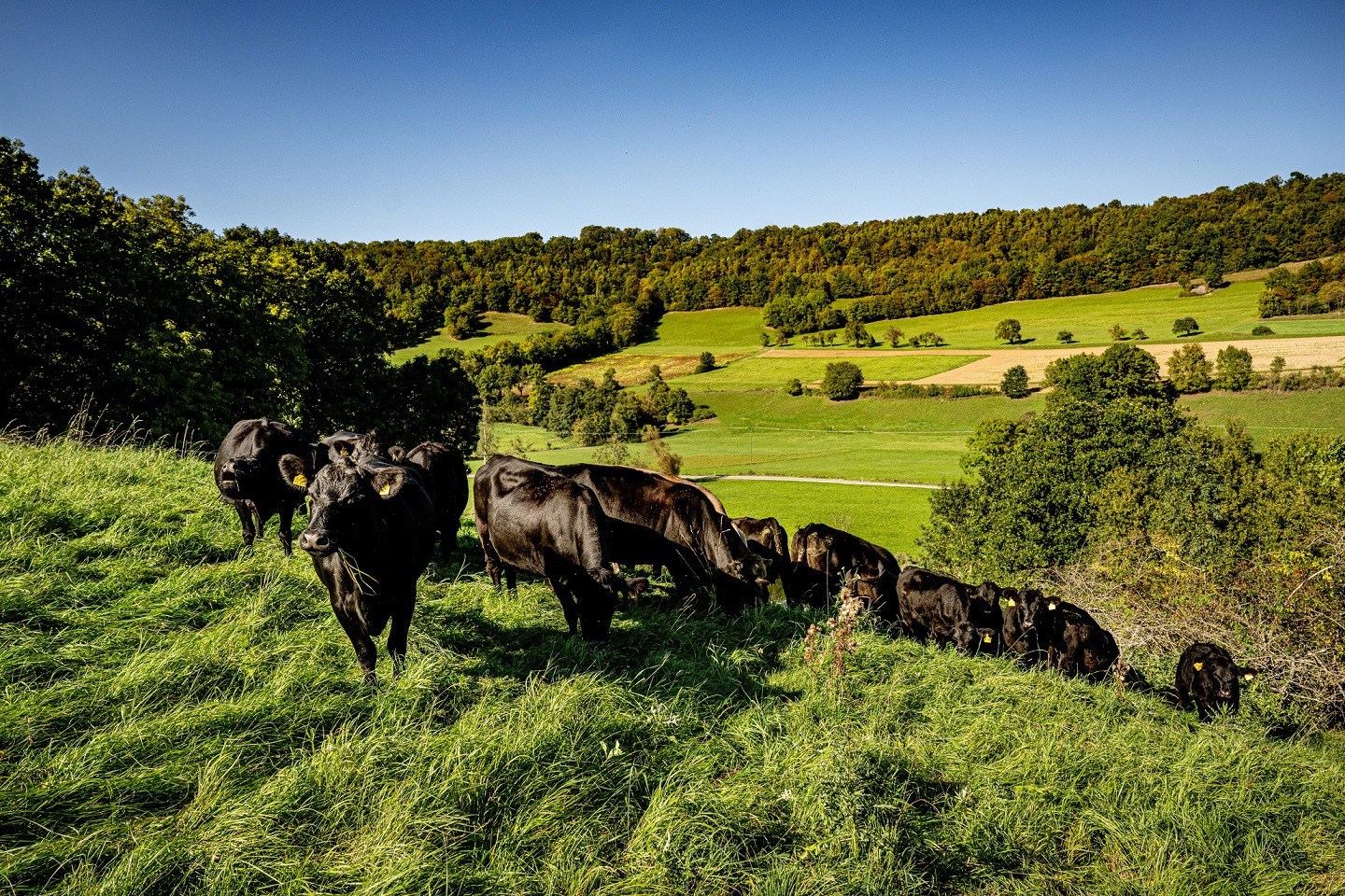 Das gemütliche Hofcafé liegt etwas abgelegen mitten im idyllischen Jagsttal. Auf 40 Hektar Grünland grasen gleich nebenan Angusrinder in Mutterkuhhaltung, Lamas und Strauße. Idylle pur!