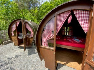 Übernachte inmitten der Weinberge: Entweder im gemütlichen Weinfass oder im Trapperbus mit Dachterrasse, immer inklusive leckerer Verpflegung.
