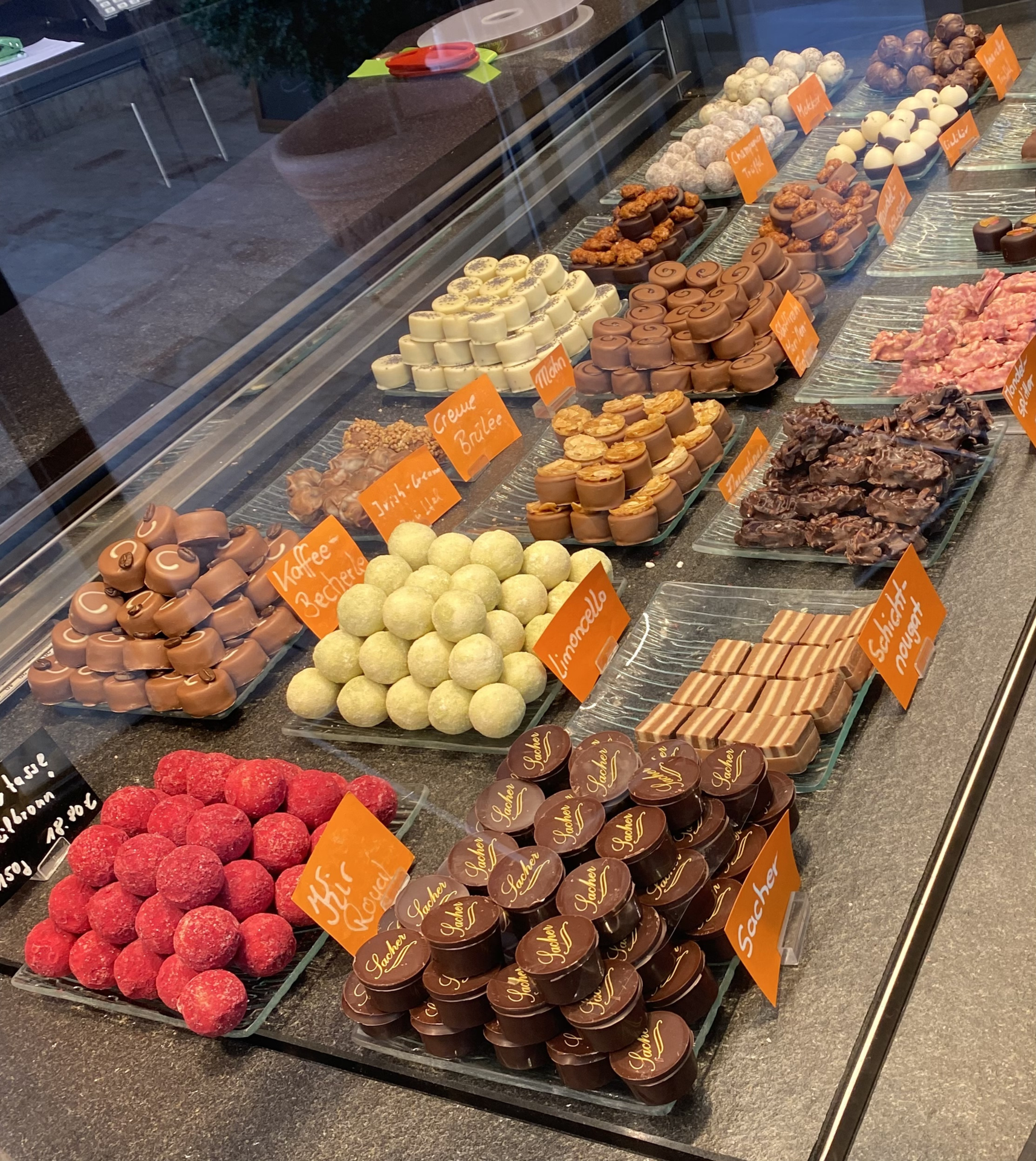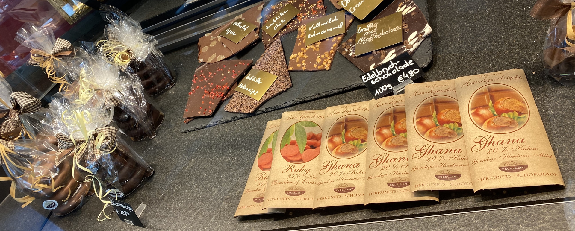 - täglich wechselnde Angebote (hauseigenes Teegebäck, Edelbruchschokolade, hausgemachte Frucht- und Schokoladenaufstriche, Pralinen, Trüffel und Königsberger Marzipan): https://www.chocolaterie-kaffe..., https://www.chocolaterie-kaffe...