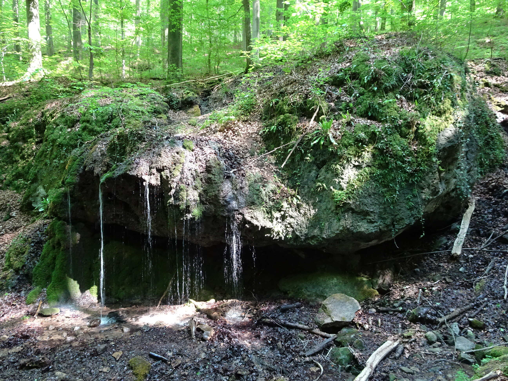 Es geht entlang des Hesseltbächles hinein in die Klinge, später oberhalb des Bachs auf einem Forstweg durch den Wald. Nach wenigen Minuten (0,8 km) erreicht man den Kalksbrunnen.