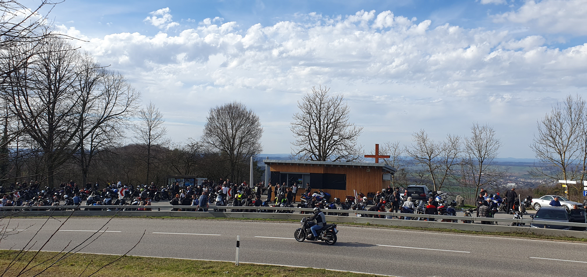 Seit über 30 Jahren ist "Die Platte" einer der beliebtesten Treffpunkte für Motorradfahrer weit über Süddeutschland hinaus. Vom Parkplatz an der B39 zwischen Löwenstein und Wüstenrot genießt man einen atemberaubenden Ausblick über das Weinsberger Tal, bis hin zum Odenwald und der Hohenloher Ebene.