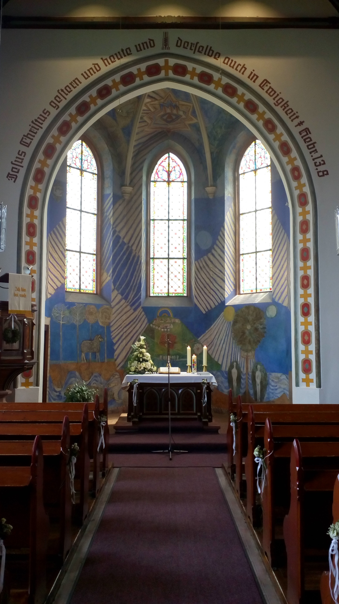 Der Chorraum der Kirche wurde 1958 von dem Heidelberger Künstler Peter Dreher neu ausgestaltet und 2002 vom Künstler selbst restauriert. Die Bemalung zeigt hauptsächlich Szenen der Schöpfungsgeschichte.