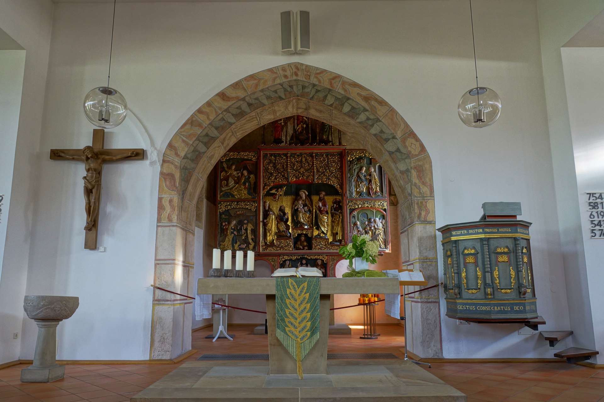 Kirche aus dem 15. Jahrhundert, mit Erweiterung aus den 1970er-Jahren, mit kunstvollem Hochaltar von 1520.