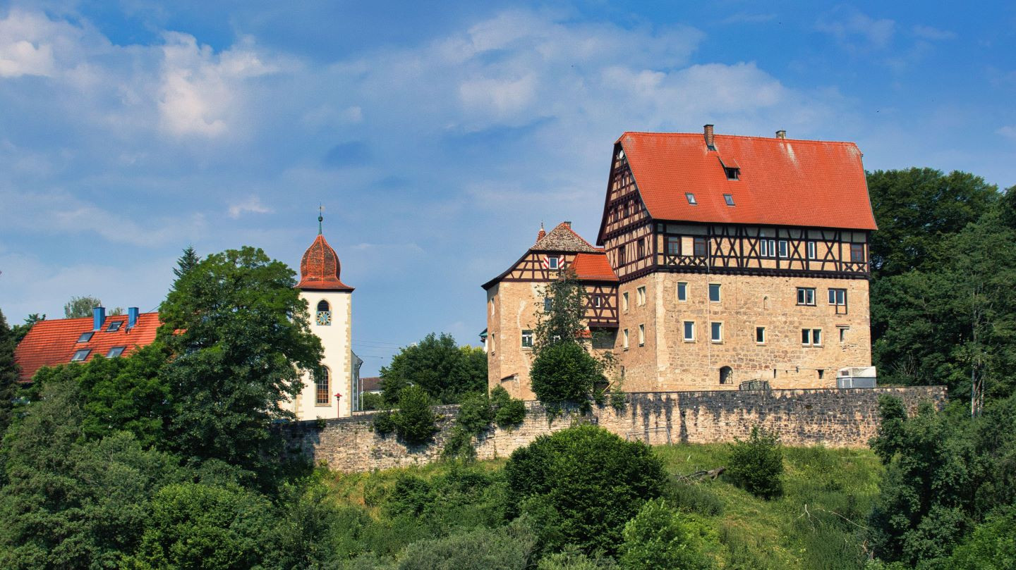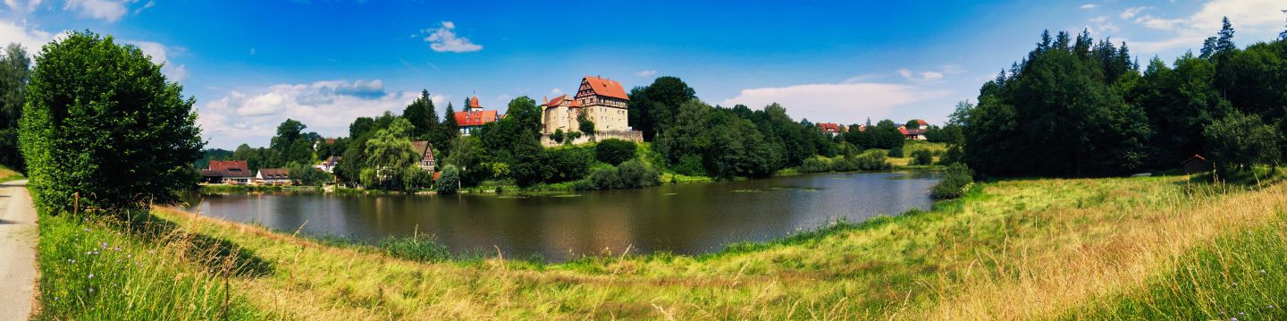 Ausgehend von der Langen Straße westlich des Schlosses etwa 200 m in West- Süd-West-Richtung, dann nach Haus Nr. 29 biegst du links in ein Tal ab. Vor dem Bach biegst du rechts ab, überquerst diesen später und biegst anschließend wieder rechts ab zu einer Wegkreuzung nach einem Weiher. Weiter mit der Markierung des Jagststeigs in Süd-West-Richtung zu einem breiten Weg und von diesem wieder rechts ab.