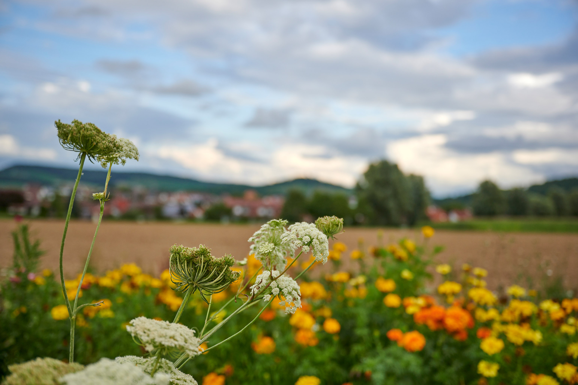 Anhöhe links, entlang der K4525 in den Ort. In der Ortsmitte