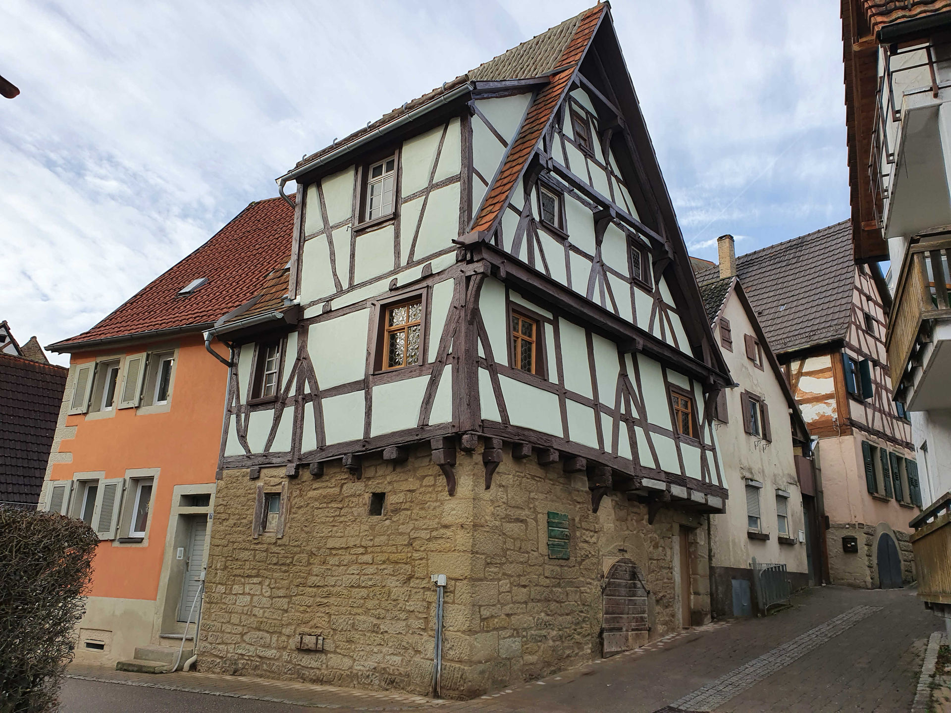 Heute führt die Gasse durch die Bahnhofswiesen am Fachwerkpfad entlang zum Bahnhof. Wer vom Bahnhof kommt, übersieht das windschiefe Fachwerkhaus Steingasse 4 nicht. Es wurde 1457 erbaut und ist damit das zweitälteste Fachwerkhaus in Eppingen.