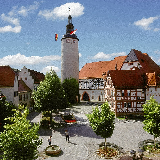 Kurmainzisches Schloss mit Türmersturm erbaut um 1280. Die östlichen Wirtschaftsgebäude stammen aus dem 15./16. Jahrhundert. Der Schlosshof wird begrenzt von dem "Jägerhäuschen", einem kleinen Fachwerkanbau aus der Renaissancezeit um 1609.