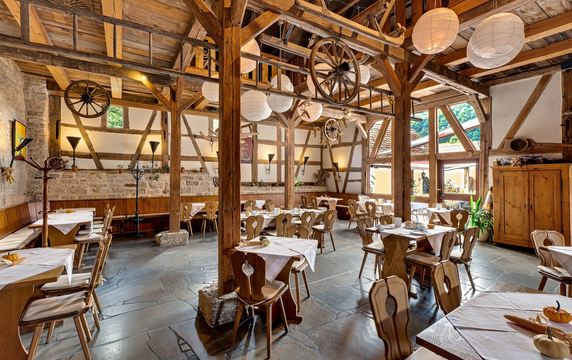 Historisches Gasthaus mit regionalen fränkischen Spezialitäten, komfortable Gästezimmer, Feiern in der Fachwerkscheune, eigene Erzeugnisse wie Wein, Honig, usw.
