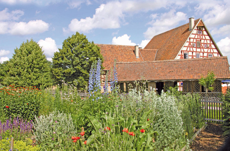 Hier lohnt ein Abstecher zum Hohenloher Freilandmuseum Wackershofen. Nach Gailenkirchen beginnt der Anstieg auf den bis zu 523 m hohen Höhenzug der Waldenburger Berge.