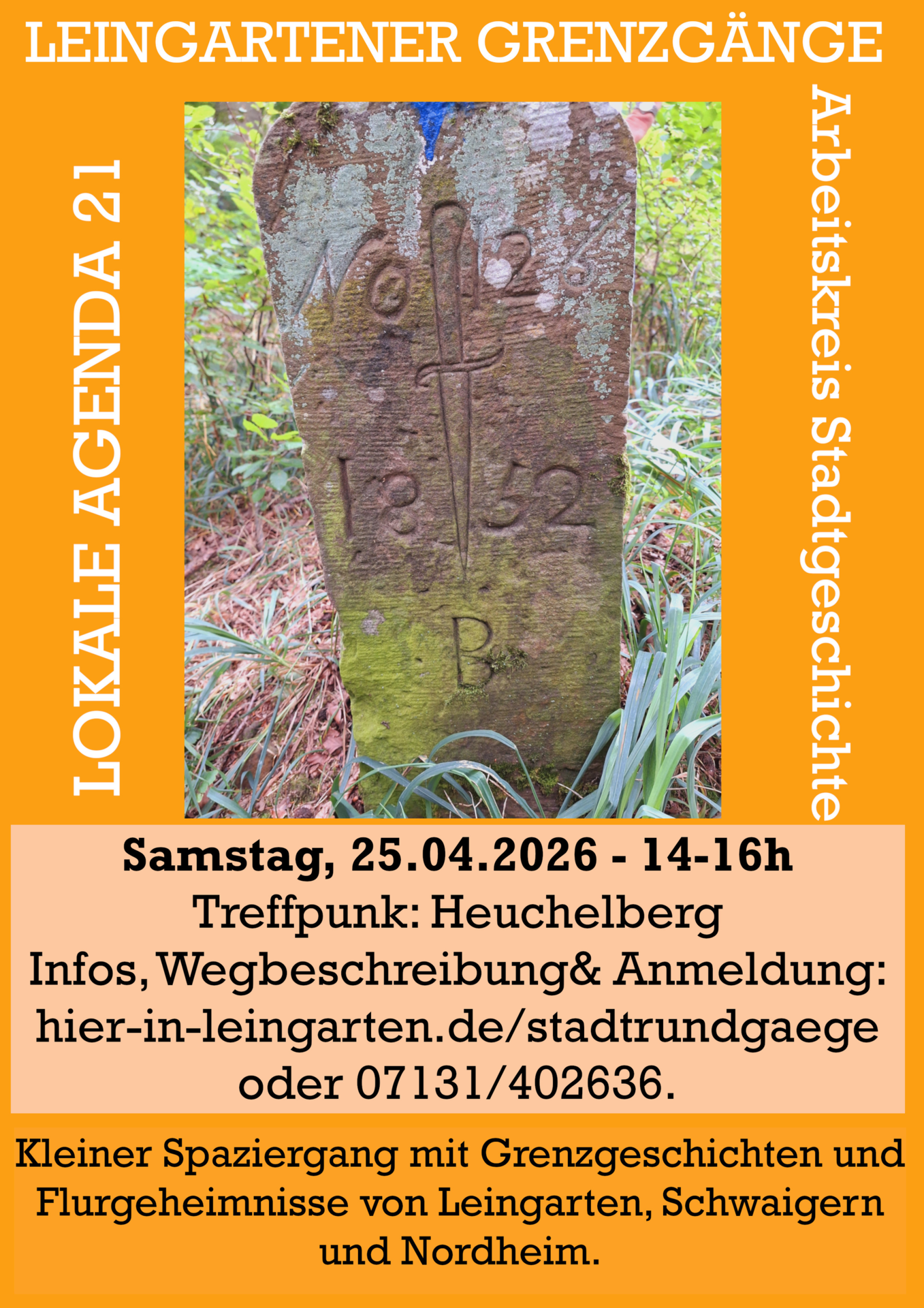 Auf wenig begangenen, überwiegend unbefestigten Wegen entlang der früheren Landesgrenze von Württemberg und Baden wollen wir etwas zur Geschichte der teilweise über 200 Jahre alten historischen Grenzsteine hören und dabei auch zum Geheimnis der eingemeißelten Zeichen und Symbole dieser denkmalgeschützten Zeitzeugen erfahren.