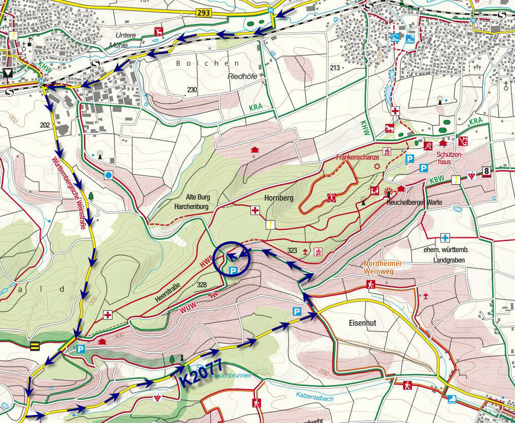 - Treffpunkt: Mittlerer Wander-Parkplatz am HW 8 auf dem Heuchelberg – Höhe Alter Burgweg