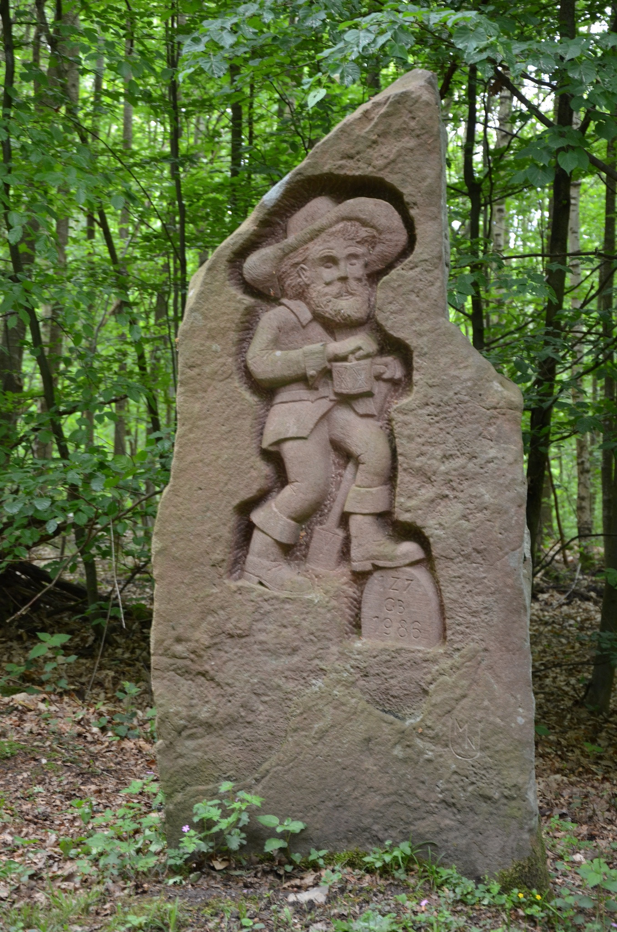 Die 17 Kilometer lange Tour beginnt in Boxtal an der Kirche in der Ortsmitte und fordert direkt zu Beginn die Wadenmuskulatur durch Streuobstwiesen bis zum Waldrand. Auf einem steilen Waldweg wanderst du hoch zu den "Hohen Steinen". Das Naturdenkmal und Geotop macht Zeit erlebbar, denn die Felsgruppe aus Sandstein ist durch Erosion entstanden. Und Steine bleiben ein Motto des Tages. Schließlich triffst du im Wald auf gleich zwei Gedenksteine: Einer ist dem Heiligen Wendelin gewidmet, der andere trägt den ungewöhnlichen Namen Hoi Hopp. Um letzteren rankt sich eine Sage, bei der es um einen Grenzverlauf und einen Geist geht.