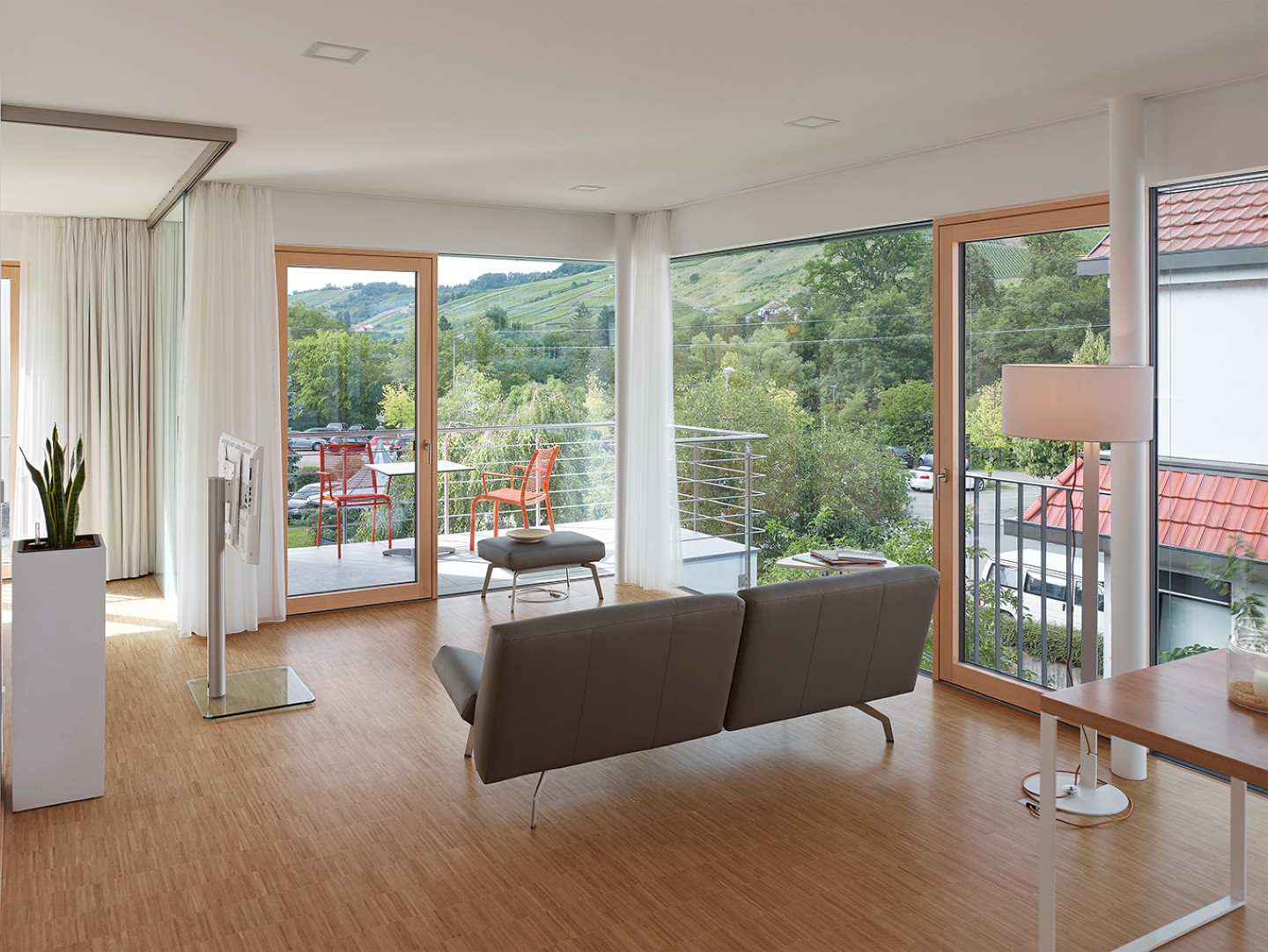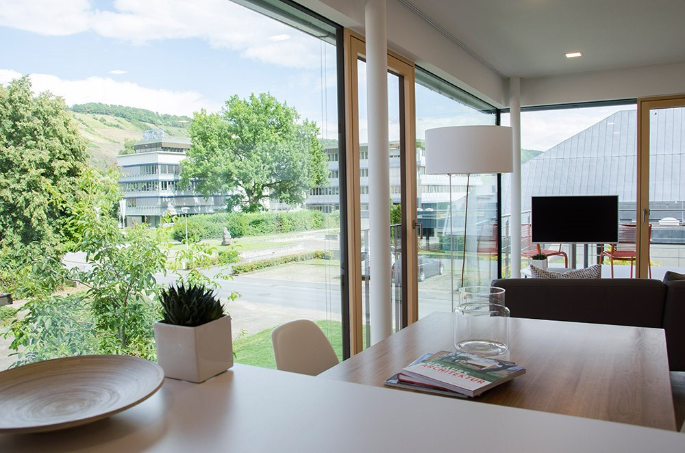 Die hellen und freundlichen Apartments bieten auf 60 qm alles, was du zum Wohlfühlen benötigst. Bodentiefe, rahmenlose Fenster holen die Natur direkt in dein Zimmer. Die Wohnungen sind der ideale Ausgangspunkt und Rückzugsort für Geschäftsreisende und Feriengäste.