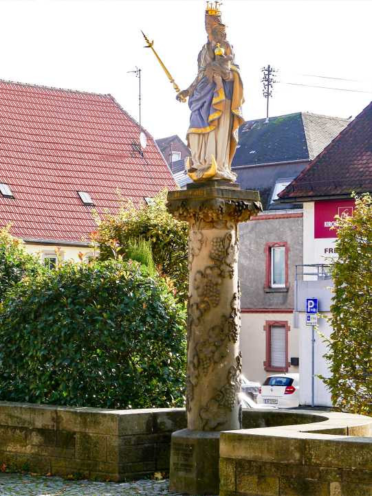 Die Mondsichelmadonna mit Jesusknaben und Zepter auf einer Weinrankensäule aus Sandstein ist das Werk des Bildhauers Michael Huber.