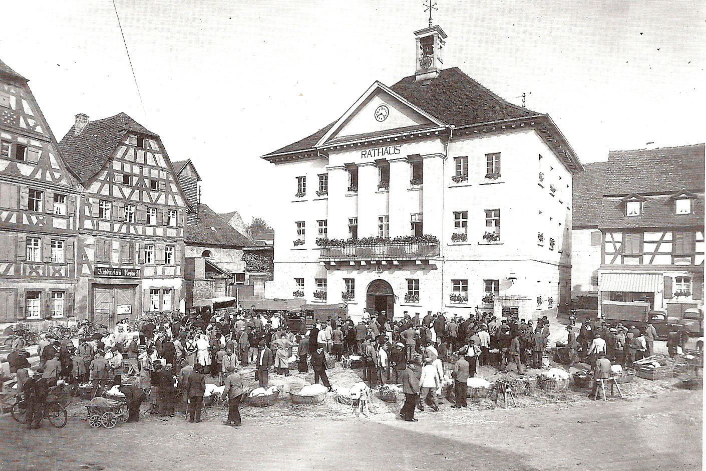 Reges Treiben entwickelte sich: Käufer und Verkäufer aus dem weiten Umland feilschten um die in großen Weidenkörben angebotenen Schweine. Geheimnisvoll anmutende Handzeichen besiegelten jeweils Kauf und Verkauf. Der Freitag war auch für manchen Gastwirt der umsatzstärkste Tag der Woche, denn dem Marktbesuch schloss sich traditionell ein Frühschoppen zum Austausch von Neuigkeiten an. 1979 wurde zum letzten Mal ein Schweinmarkt abgehalten.
