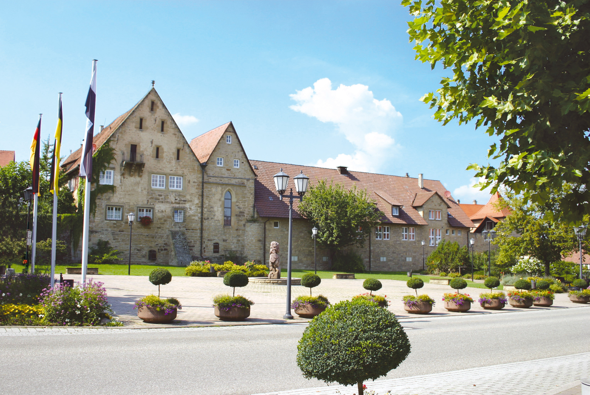Vor der imposanten Kulisse des Amthofs bildet der neue Marktplatz den Mittelpunkt des Ortes.