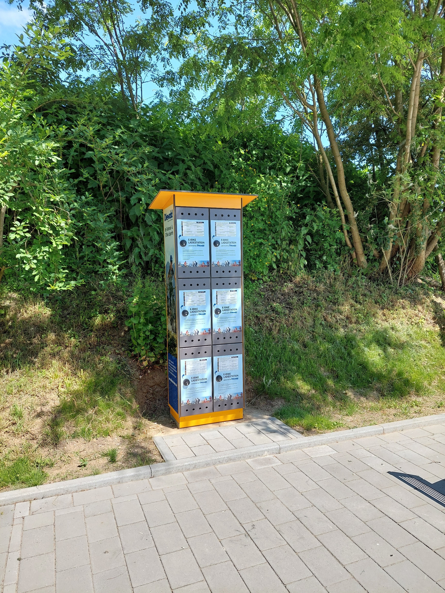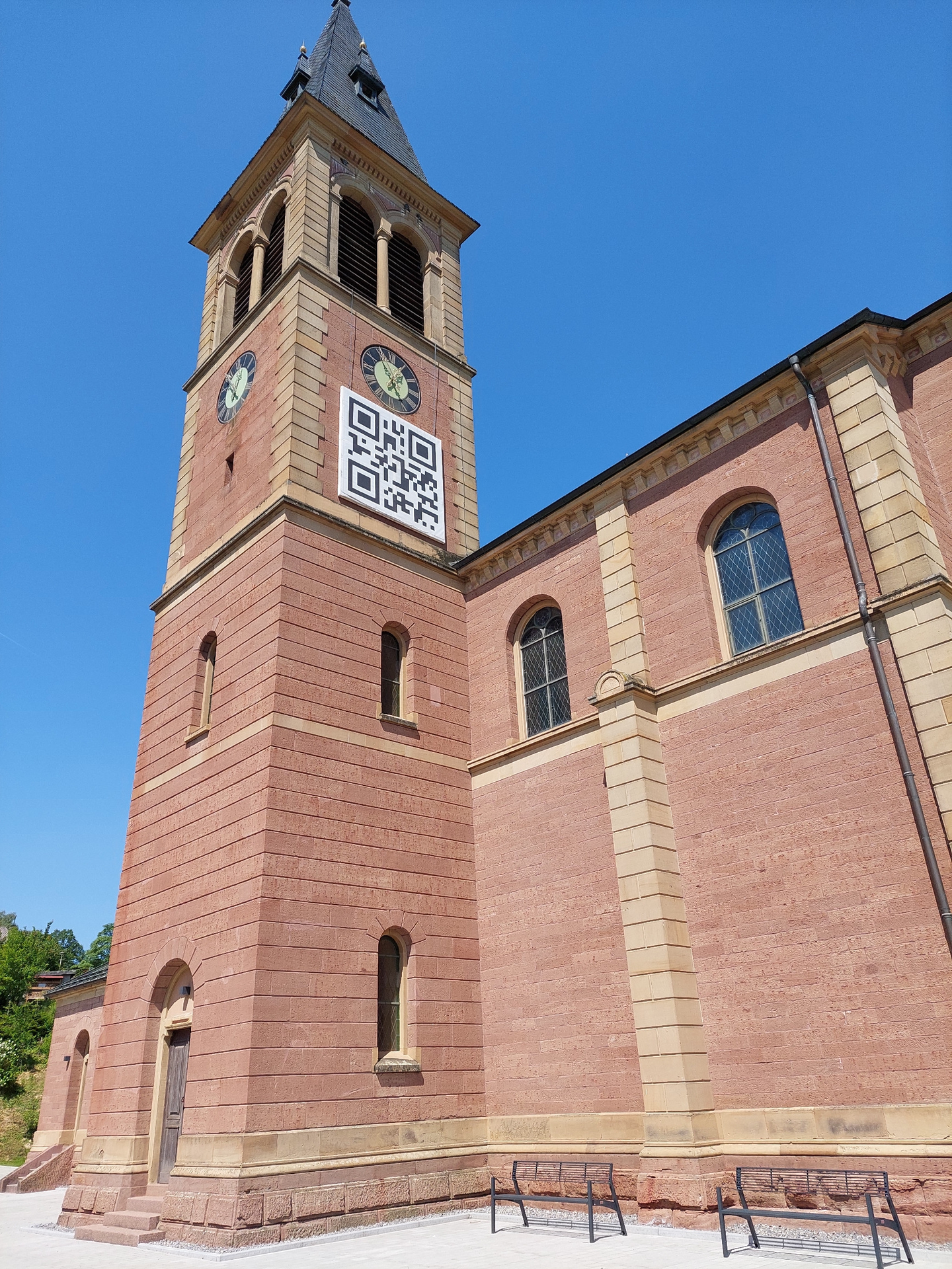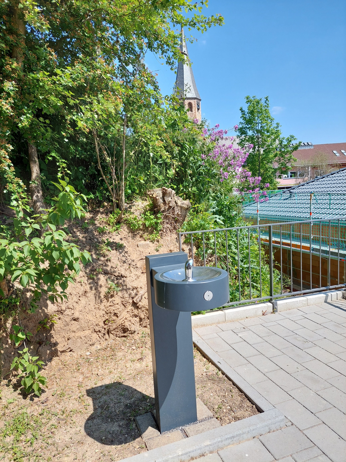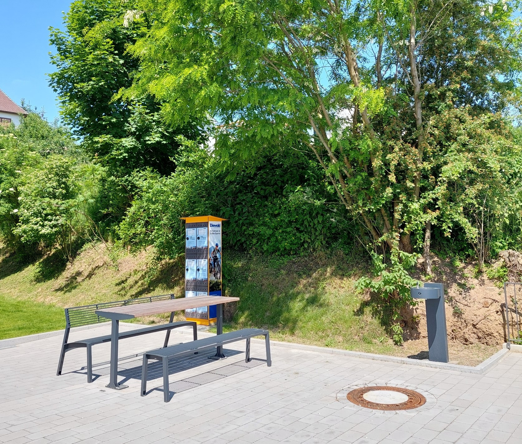 Im Außenbereich der St. Mauritius-Kiche in Kraichtal-Oberöwisheim steht Wanderern und Radfahrern ein Rastplatz mit Wasserspender und E-Bike-Ladestation zur Verfügung.