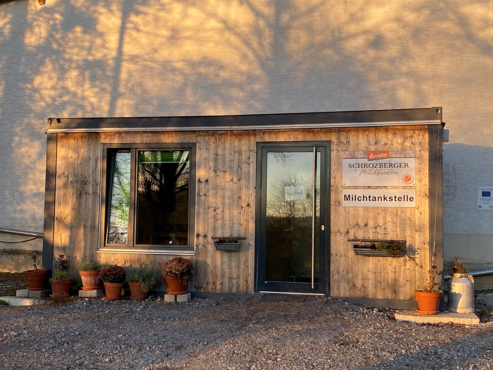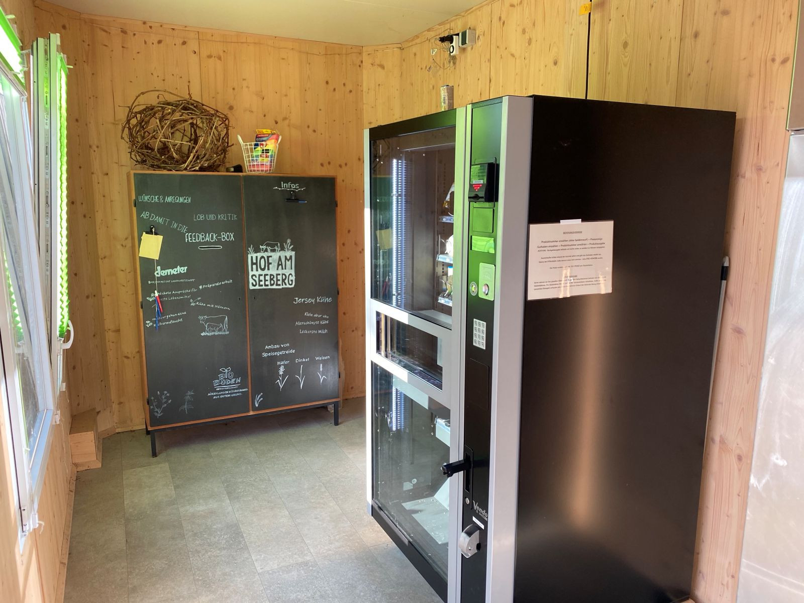 Außer der Milchtankstelle steht im Verkaufsraum ein Warenautomat. In diesem findet sich eine bunte Auswahl an Molkereiprodukten der Schrozberger Milchbauern sowie ein wechselndes Angebot verschiedener anderer Köstlichkeiten überwiegend in Bio-Qualität.