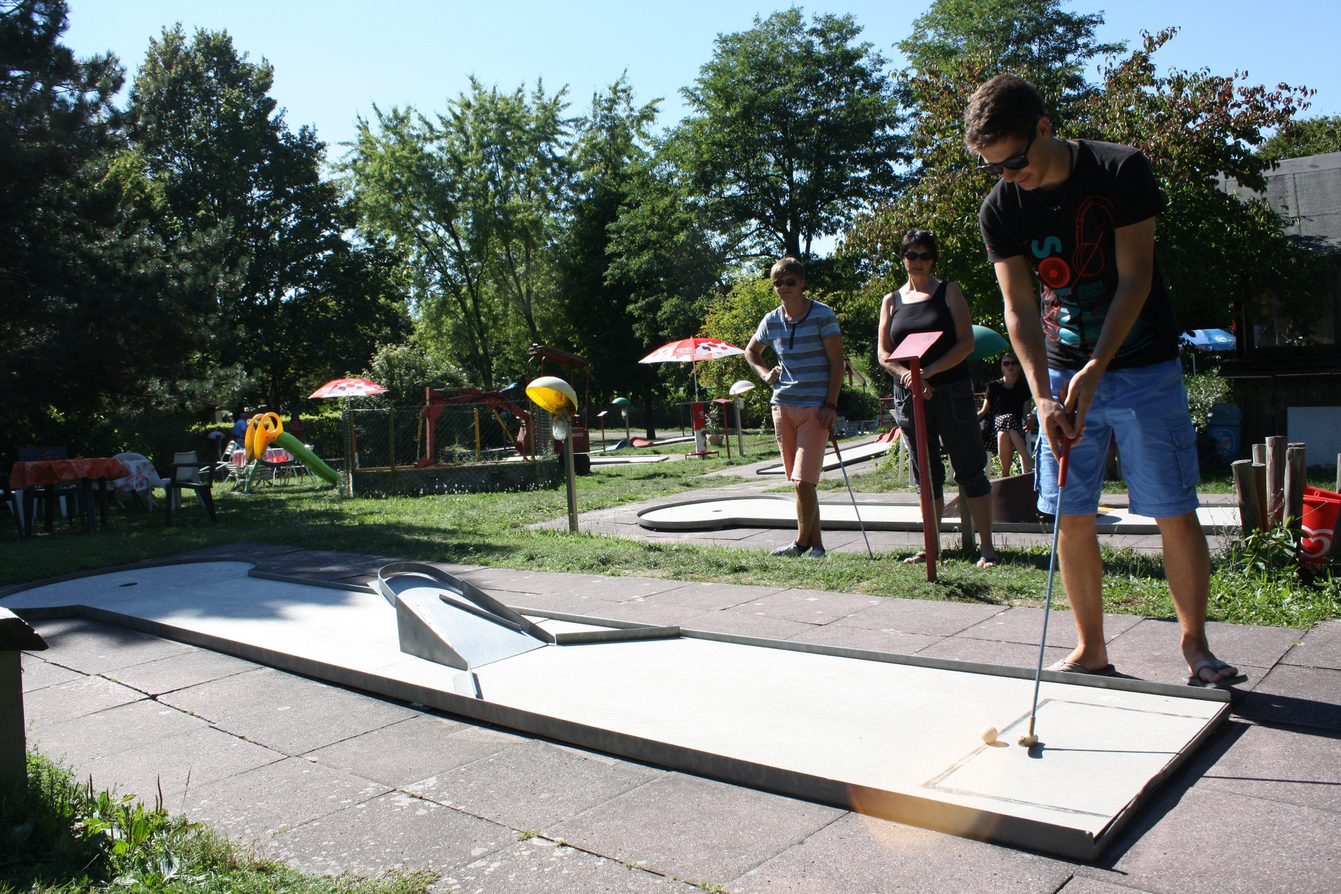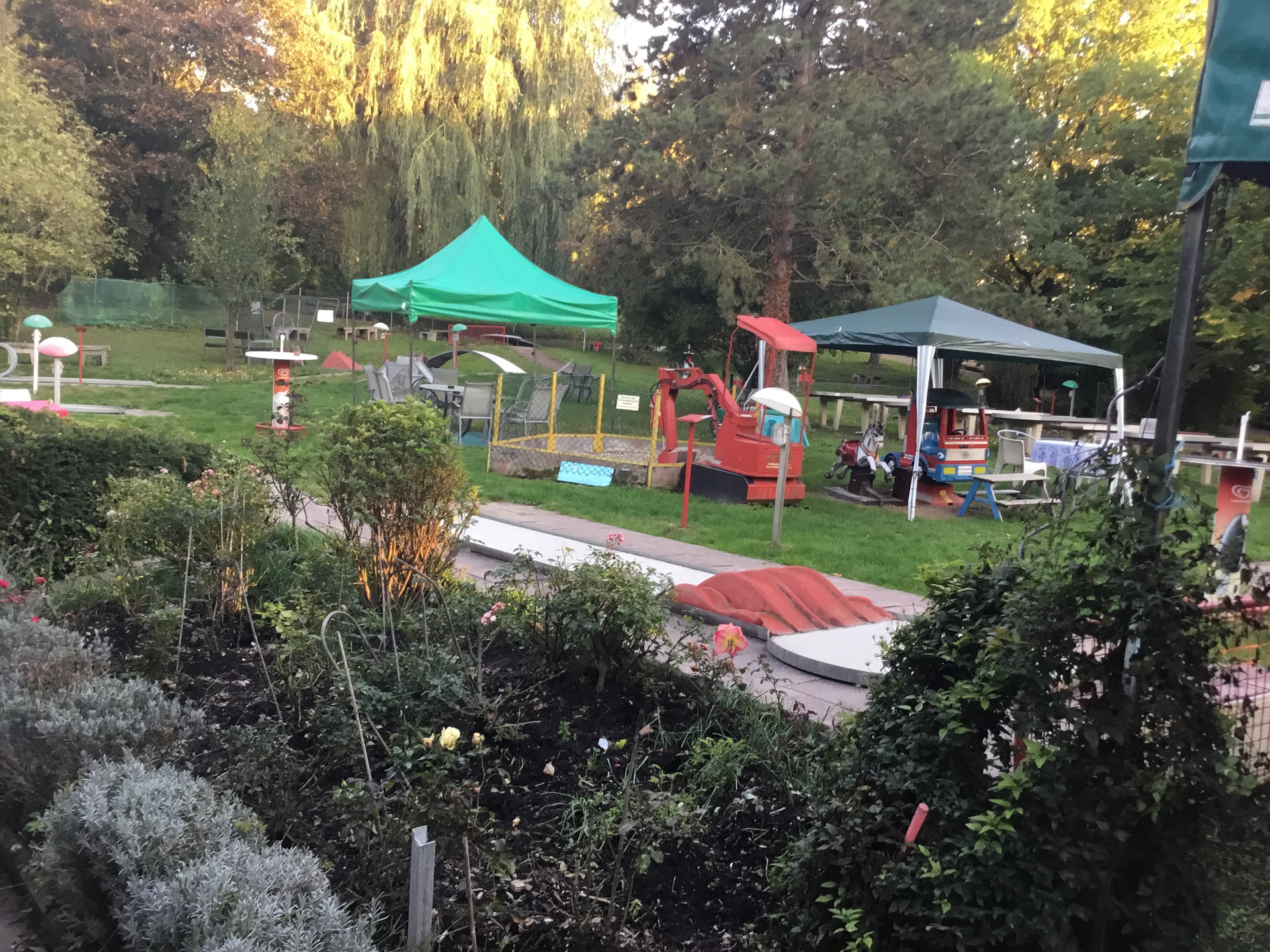 Direkt neben dem Minigolfplatz gibt es einen großen Kinderspielplatz mit vielfältigen Spielgeräten, auf dem sich die jüngsten Besucher austoben können. Eine angrenzende Kleingartenanlage sorgt für eine grüne, ruhige Umgebung und lädt zum Verweilen ein.