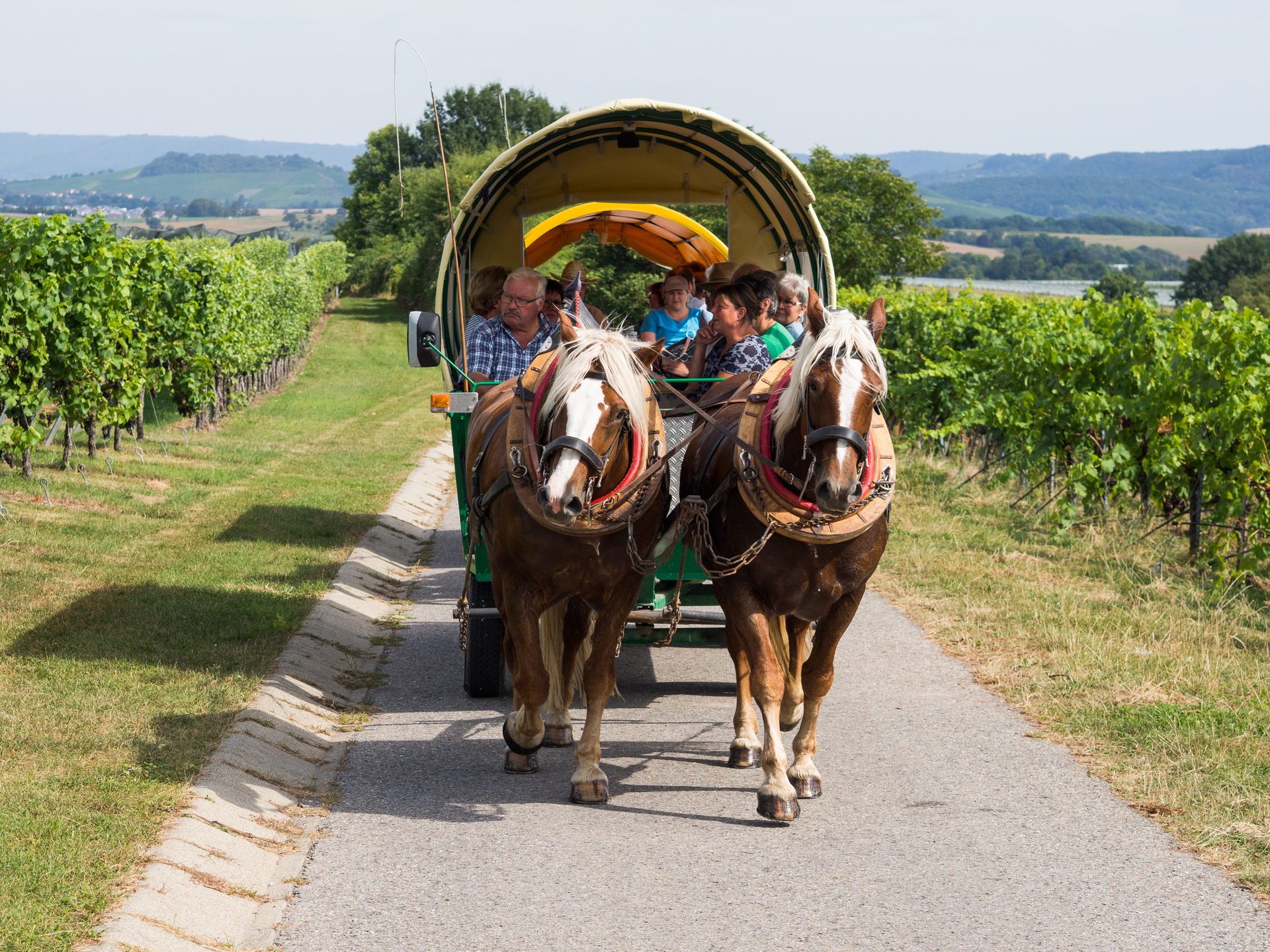 Das einzigartige Erlebnis: Weinselige Fahrt mit dem Pferdeplanwagen. Dax und Schliri, die beiden braven süddeutschen Kaltblüter schaffen auch die steilsten Wengertsbuckel, während Sie ganz entspannt herrliche Aussichten und himmlische Weine genießen dürfen.