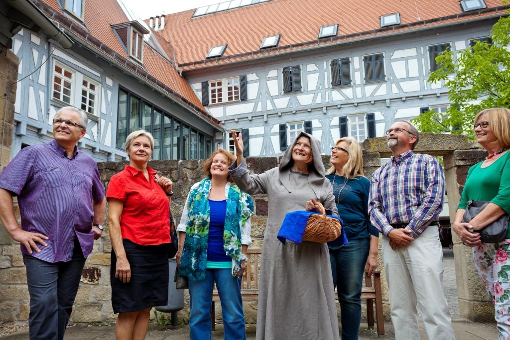 Schwester Anna, die letzte Begine Bietigheims, wandelt in ihrer Schwesterntracht durch die Altstadt. Dabei entführt sie ihre Begleiter mit Witz und schwäbischer Mundart ins Bietigheim des 16. Jahrhunderts. Geschichte und Geschichten aus der Perspektive einer frommen Frau sind das Wesen dieser besonderen Stadtführung. Nicht auf den Mund gefallen, erzählt sie auf schwäbisch vom bunten Treiben der Händler, sie beobachtet die Flößer und berichtet, was sich am 1. März des Jahres 1542 ereignete.