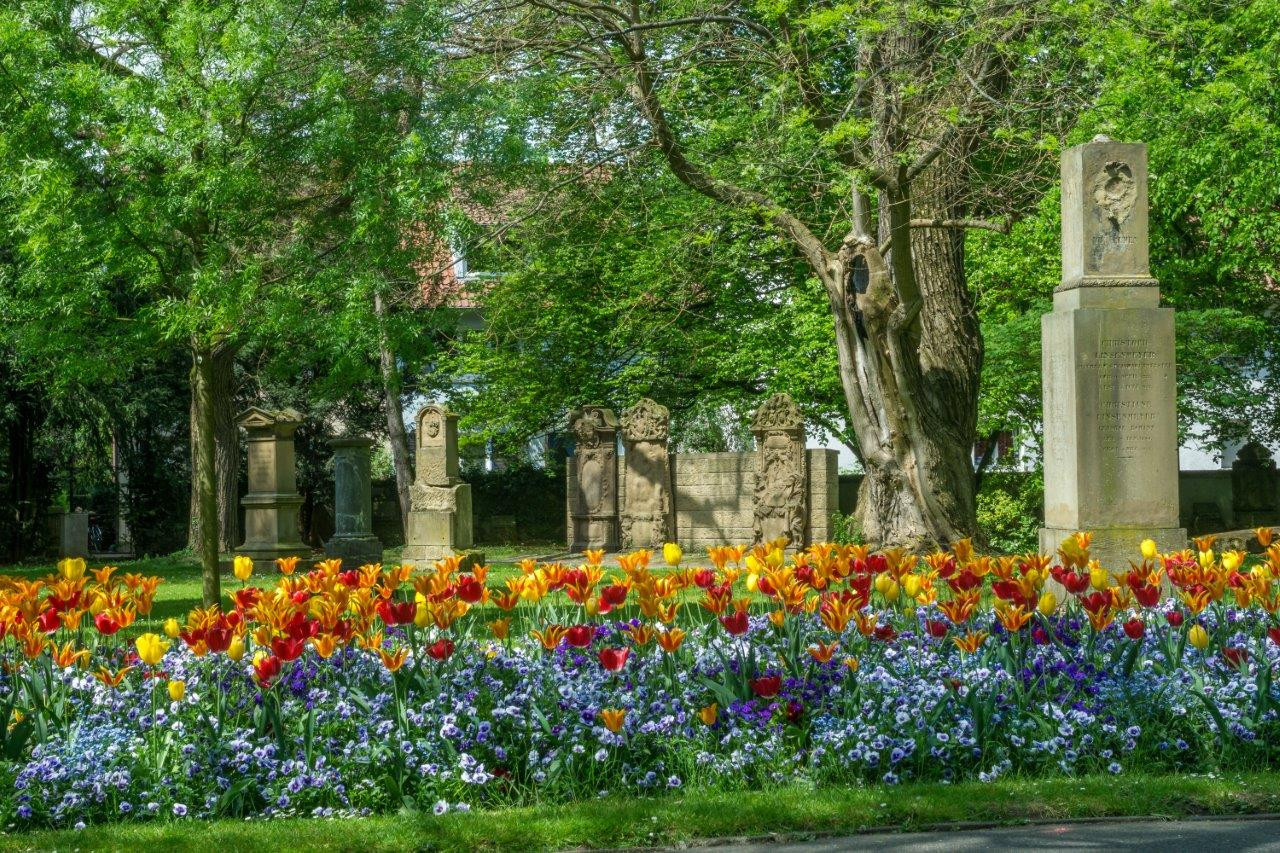 Mit behutsamer Pflege und Nachpflanzungen für abgängige Bäume wird die hohe Wertigkeit des „Alten Friedhofs“, der heute als öffentliche Grünanlage genutzt wird, erhalten.