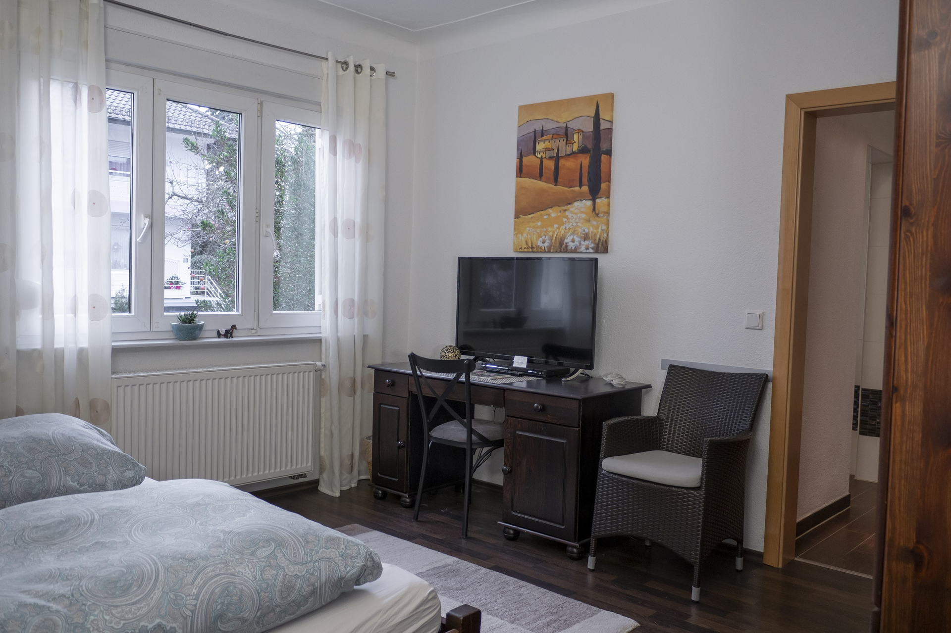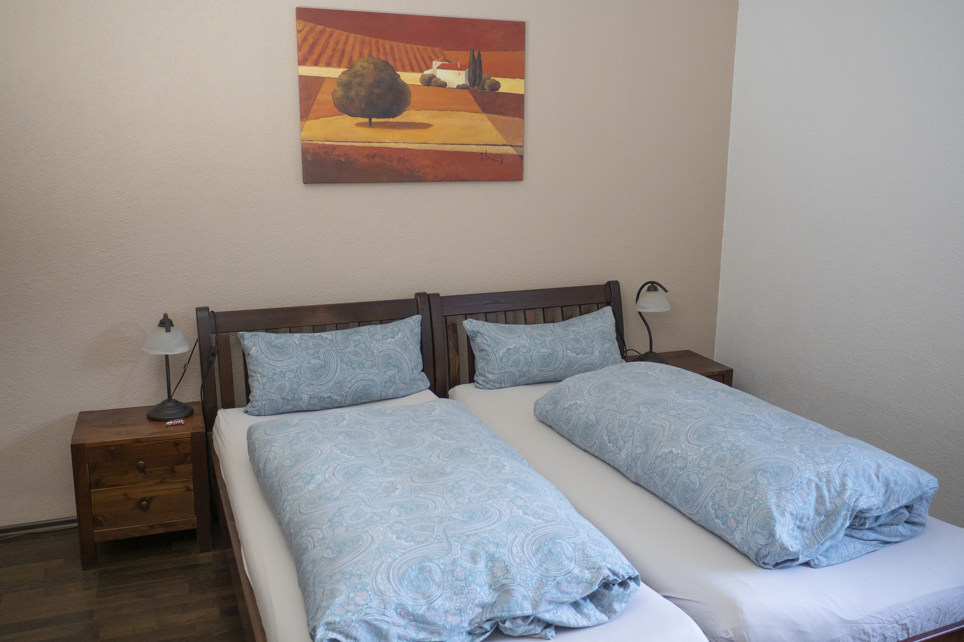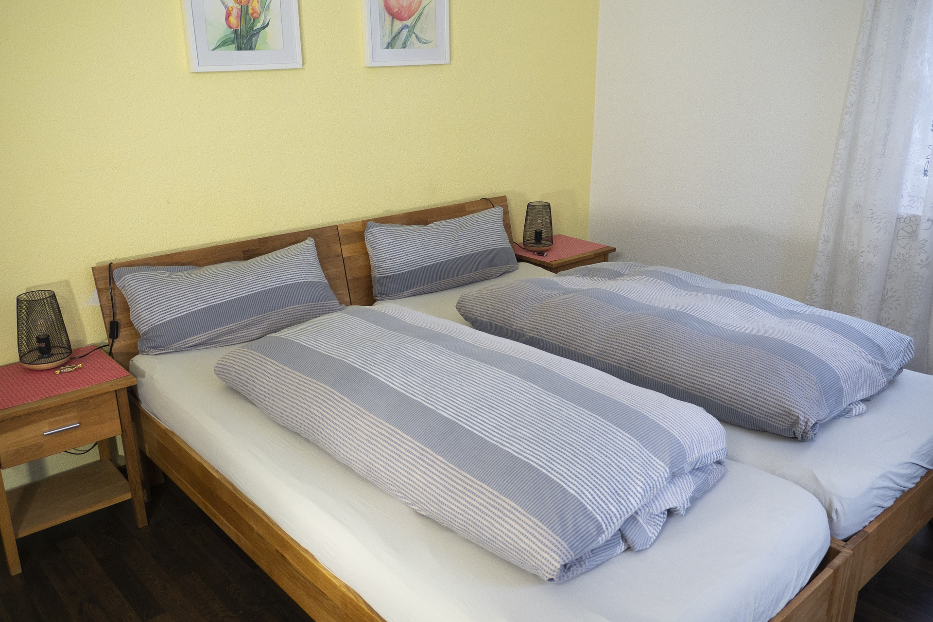 Es gibt ein Doppel- und ein Dreibettzimmer. Beide Zimmer verfügen jeweils über ein eigenes Badezimmer. Beim Dreibettzimmer ist das Badezimmer über den Flur erreichbar, beim Doppelzimmer ist es direkt ans Schlafzimmer angrenzend.