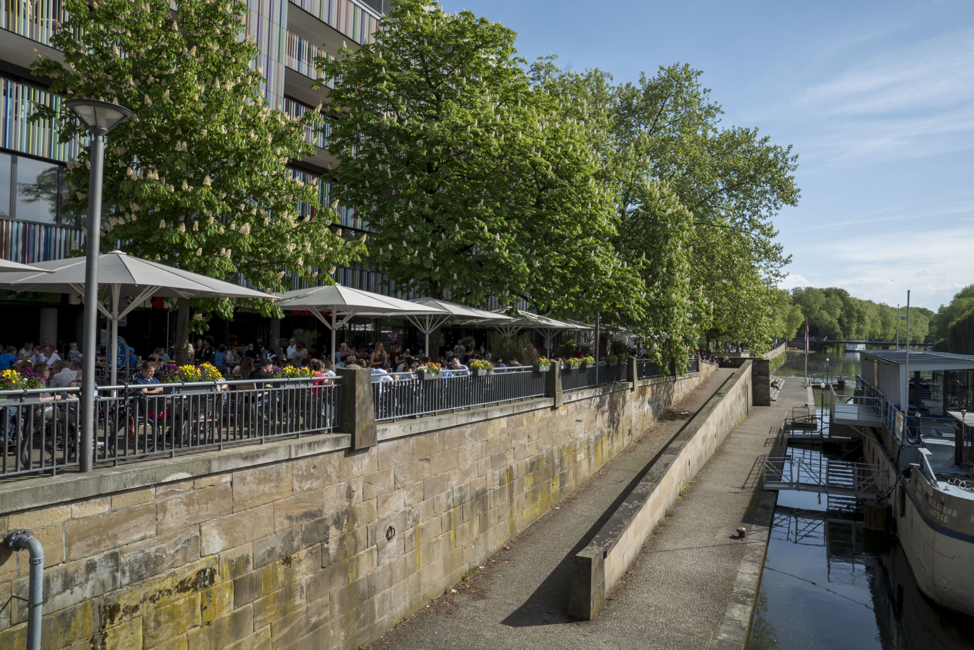 Im Sommer kommen zum Flair der gastronomischen Terrassen zahlreiche Veranstaltungen. Im Winter bezaubert die Meile durch Weihnachts- und Brückenbeleuchtung.